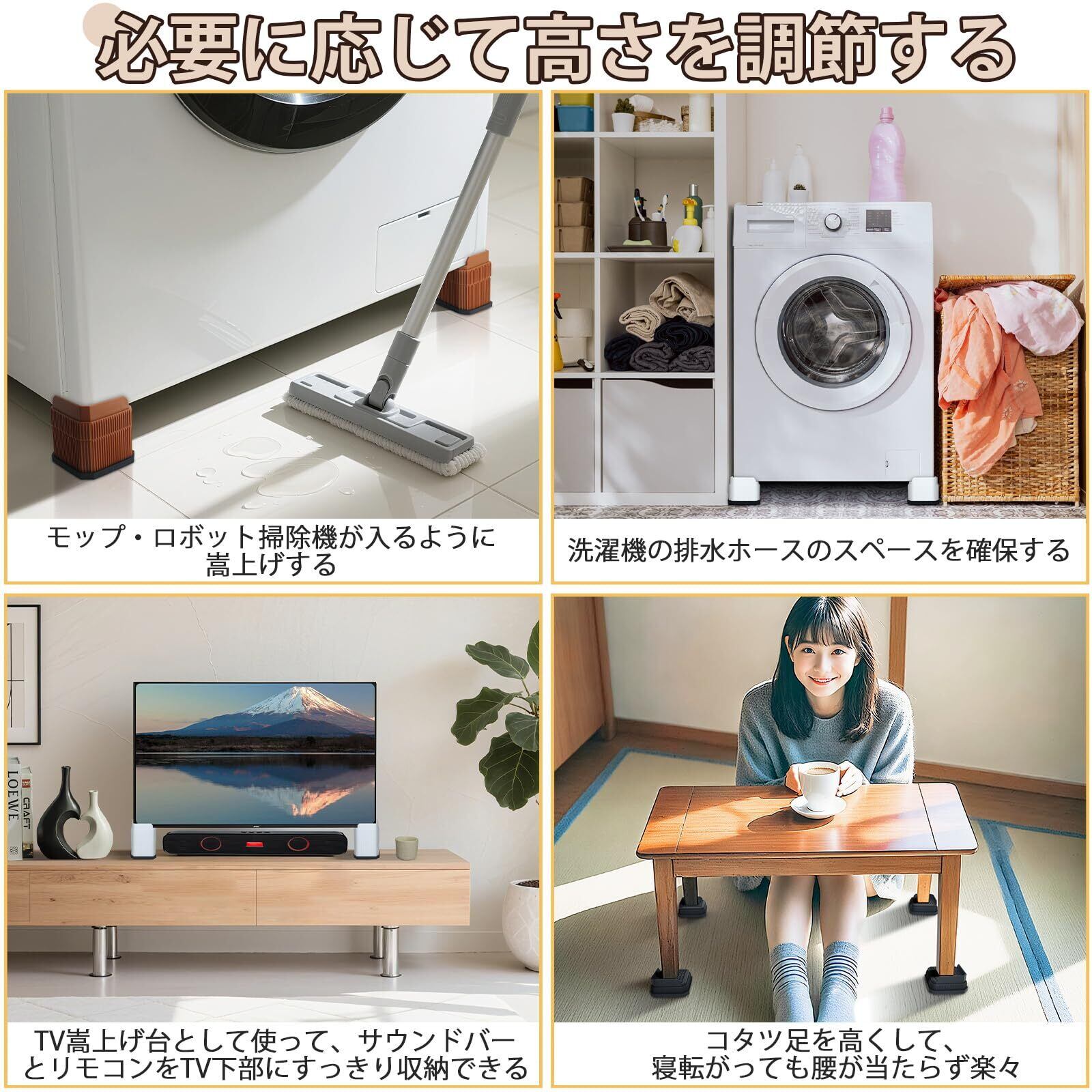【高さ調整器具】洗濯機やテーブル脚やコタツ足などを高くする器具です。嵩上げ高さは2.5センチとなります。脚を置く天面のサイズ(6.4×6.4cm)がほとんどの家電製品と家具の脚に合っています。2個または4個を併用したら、大きめサイズの足にも対応しています。※適用対象:縦型・ドラム式洗濯機、冷蔵庫、食洗機、エアコン、ソファー、ベッド、テーブル、机、こたつテーブル、座卓、キャビネットなどの家電製品と家具