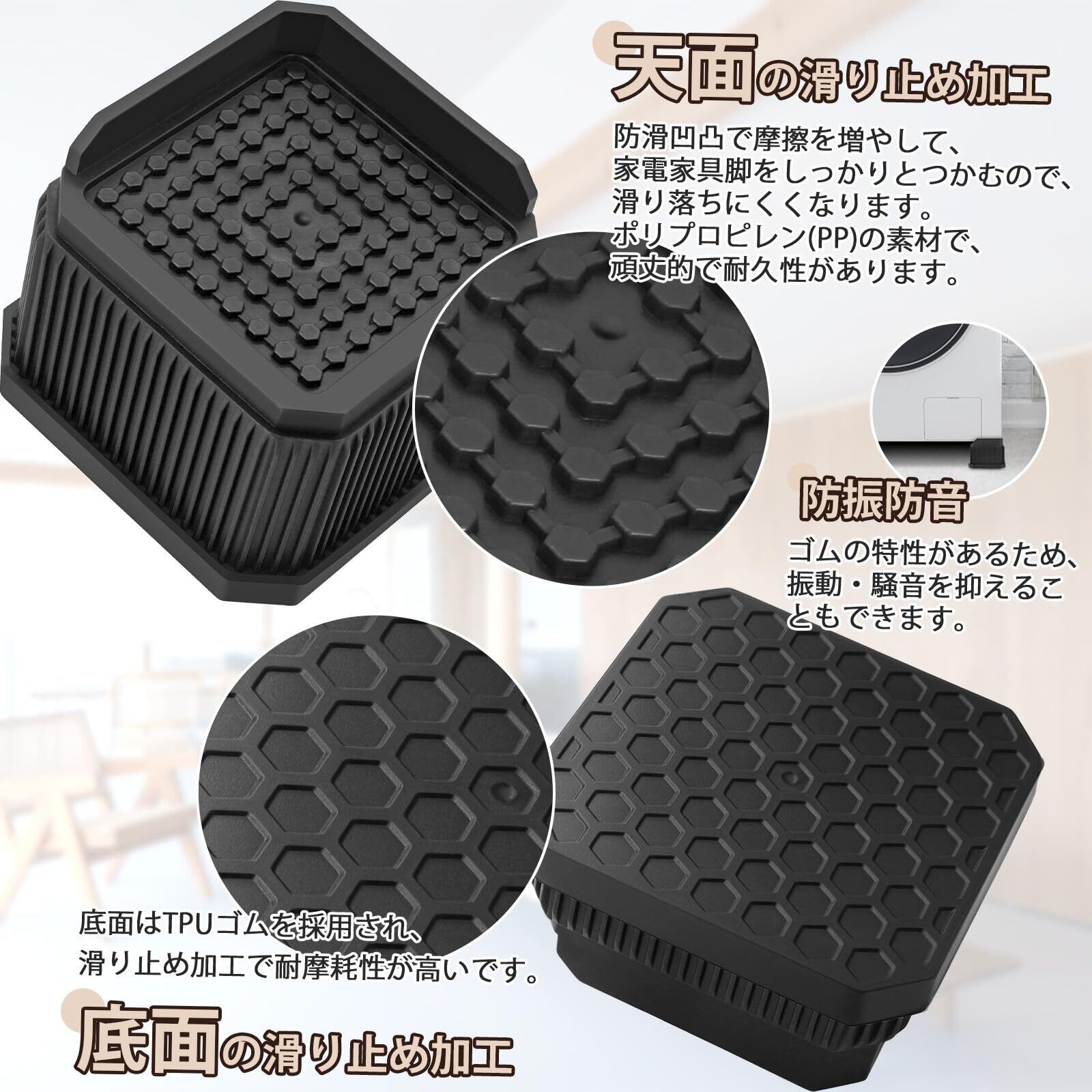 【滑り止め】天面の防滑凹凸で摩擦を増やして、家電家具脚をしっかりとつかむので、滑り落ちにくくなります。ポリプロピレン(PP)の素材で、頑丈的で耐久性があります。底面はTPUゴムを採用され、滑り止め加工で耐摩耗性が高いです。