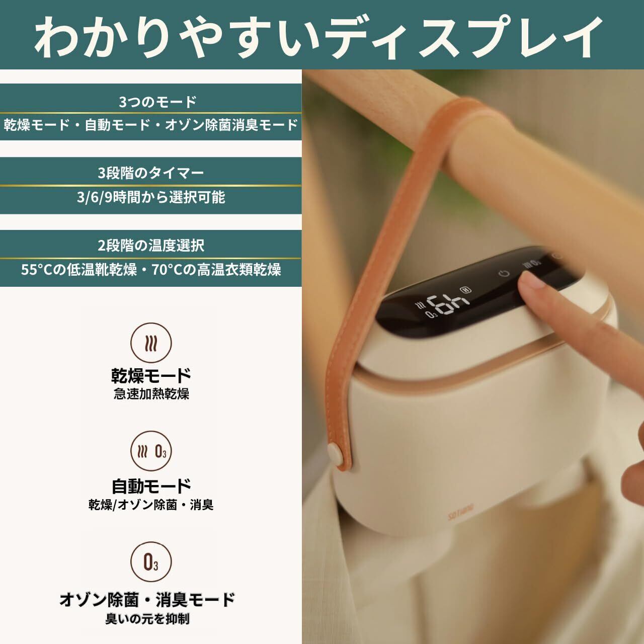最先端テクノロジー搭載!ダブルファンの衣類&靴乾燥機 衣類だけでなく、同梱のホースを使って靴の乾燥も可能なこの乾燥機は 自然乾燥と比べて驚くべき差を実感できます! POINT1 ダブルファンの効果 通常の靴乾燥機の単一ファンとは異なり、ダブルファンの設計で熱線の熱量を倍増。 二つの風路で乾燥することで、効率が向上し、広範囲にわたります。 POINT2 専用カバーで高い密閉度 高い密閉度を誇る専用カバーは、60℃の熱風を均一に循環させ しわのできにくい三次元乾燥を実現。靴や衣類を素早く快適に乾かせます。 POINT3 オゾン除菌機能 オゾンが有害物質を効果的に分解。高温で乾燥することで、衣類の除菌も可能。 清潔で安心な乾燥を実現します。 POINT4 静音&コンパクト 約45dbの低ノイズ設計で、睡眠を妨げることなく静かに乾燥。 コンパクトなサイズで持ち運びも便利。出張や旅行にもぴったり! ゴールデン・ピン・デザイン・アワード受賞 スタイリッシュなデザインがゴールデン・ピン・デザイン・アワードで プロダクト・デザイン賞を受賞。クリスマスプレゼントにも最適! この一台で、快適な乾燥と洗練されたデザインをお楽しみください!