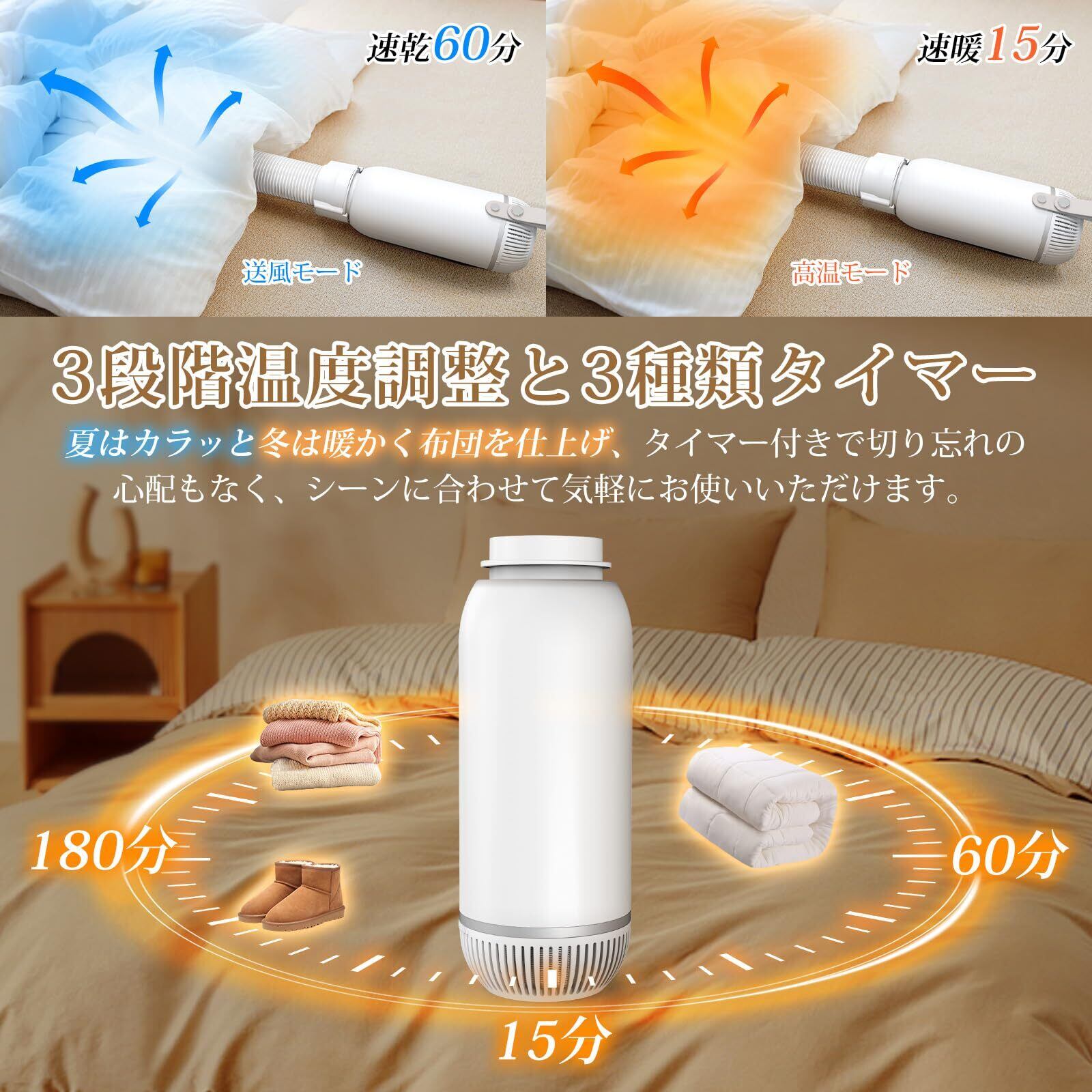 【一台で多役・中使える万能乾燥機】こんなお悩みはありませんか「花粉の季節に布団を外に干せない…」「梅雨で部屋干しの衣類がなかなか乾かない…」「旅行先で洗濯物を干す場所に困る…」「ペットの体やブラシをさっと乾かしたい…」このコンパクト布団乾燥機が、すべて解決します。布団はもちろん、衣類・靴・クローゼット内の湿気取りまで、一台でこなせる多機能設計。高温風を使えばダニ対策もでき、天日干しが難しい時期でも布団を清潔に保てます(※60℃の環境で15分以内にダニは死滅すると言われています)。春の花粉、夏の湿気、秋の長雨、冬の寒さ——季節を問わず、家族の健康と快適な暮らしをサポートする、まさにオールシーズンの必須アイテムです。