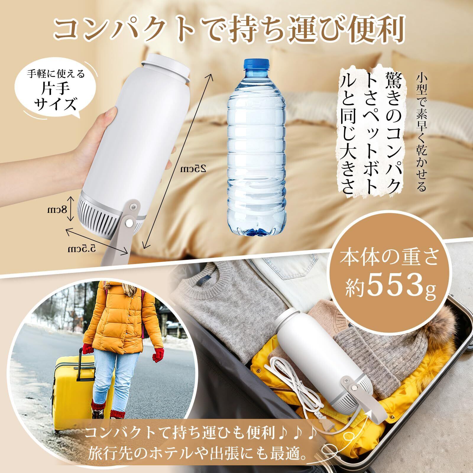 【ペットボトルサイズの衝撃!一人暮ら・旅行・出張大活躍】ペットボトルほどの大きさ(22.5×8×5.5cm)で、重さはたったの553g。片手で軽々持ち運べるので、一人暮らしはもちろん、旅行や出張先のホテルにもぴったり。忙しい朝はワンタッチでセットして出かけ、帰宅時には消臭とダニ対策が完了。寝る前にもボタン一つでふっくらさらさらの布団に仕上がり、毎日の快適な睡眠を手軽にサポートします。省エネかつ安全設計のこの一台は、大切な人への温かい贈り物にも最適です。