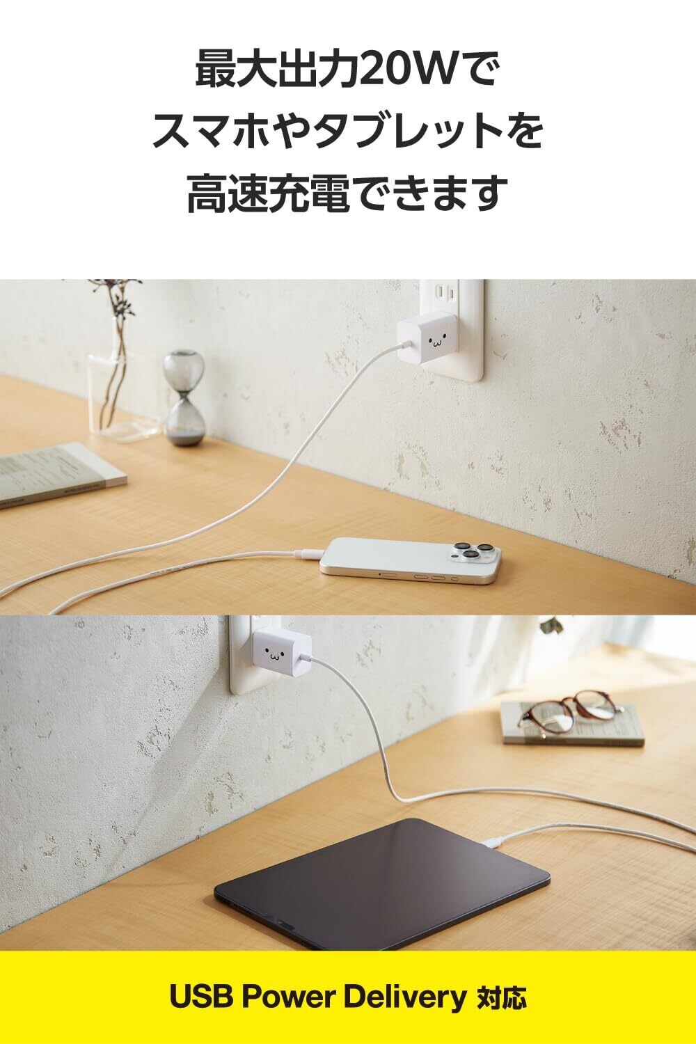 エレコム 充電器 Type-C USB-C 20W USB PD対応 ケーブル一体型 1.5m PSE認証品 GaN採用 折りたたみ式プラグ しろちゃん EC-AC6920WF