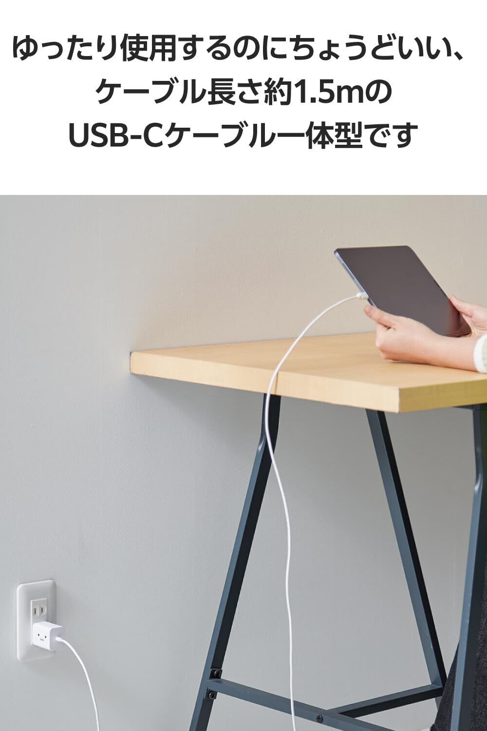 ■USB Type-Cプラグの一体型ケーブルはテーブル付近のコンセントに接続して充電するにはちょうどいい長さの約1.5mです。