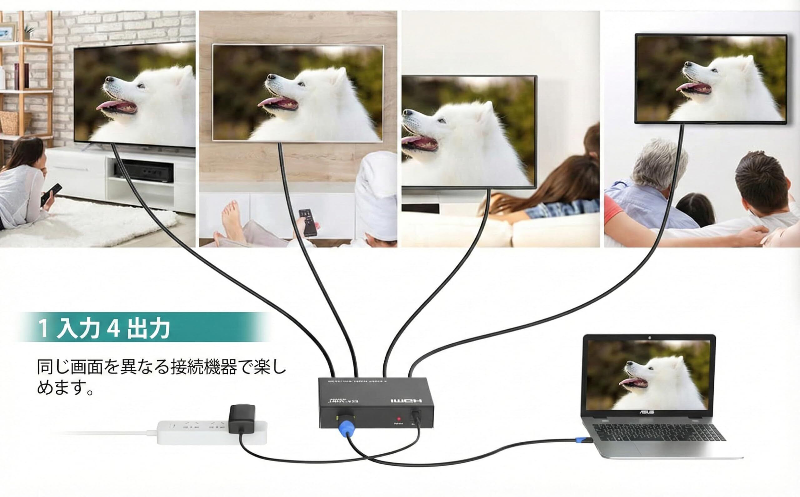 【1入力4出力 同時出力】1台のHDMIデバイスの信号を高画質・高音質のまま4台のHDMI入力端子付きデバイス(ディスプレイ・プロジェクターなど)に同時に分配出力できるHDMI分配器です。その詳細はビデオ操作で確認できます。