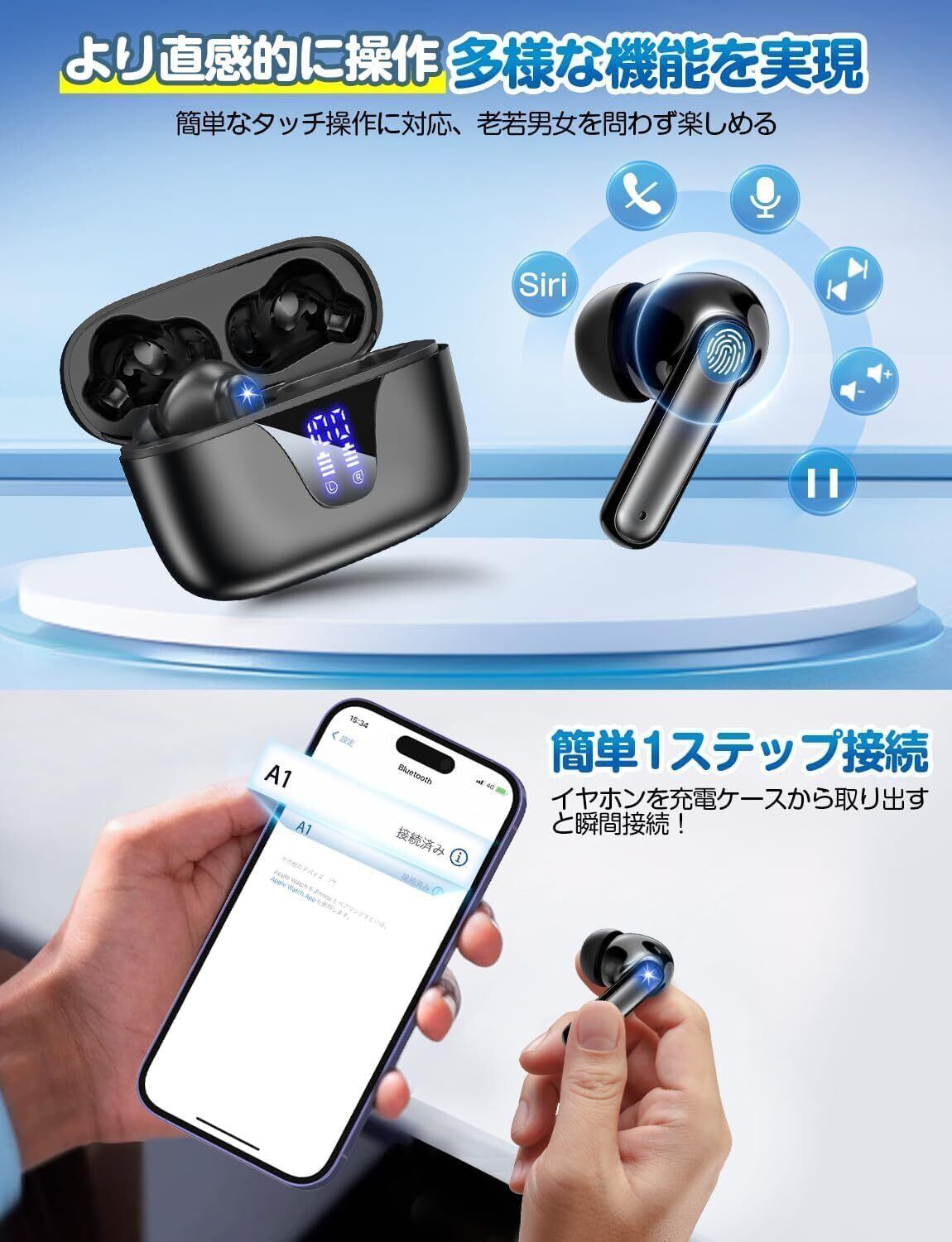 イヤホンBluetooth 5.3スムーズ通信:【瞬接・無遅延】最新ぶるーとゅーす5.3を採用し、従来比で接続速度が最大2倍、遅延はほぼゼロ。スマホを取り出した瞬間、イヤホンが自動で再接続——面倒なペアリングは過去のもの。動画視聴やモバイルゲームでも「音ズレ」を感じさせないスムーズな同期性能で、映画もゲームも完全没入型体験に。イヤホン bluetooth 5.3搭載のワイヤレスイヤホンは、Wi-Fi・電子機器・多数のBluetooth機器が混在する信号過密エリアでも、途切れや遅延なく安定接続。通話も音楽も途切れない快適さで、流暢な使い心地を実現します。【片耳も自由】片耳単体使用にも完全対応。シーンに合わせて自由に使い分けられます。“つながる速さ”と“伝わる声”、両方で日常をもっと快適に。