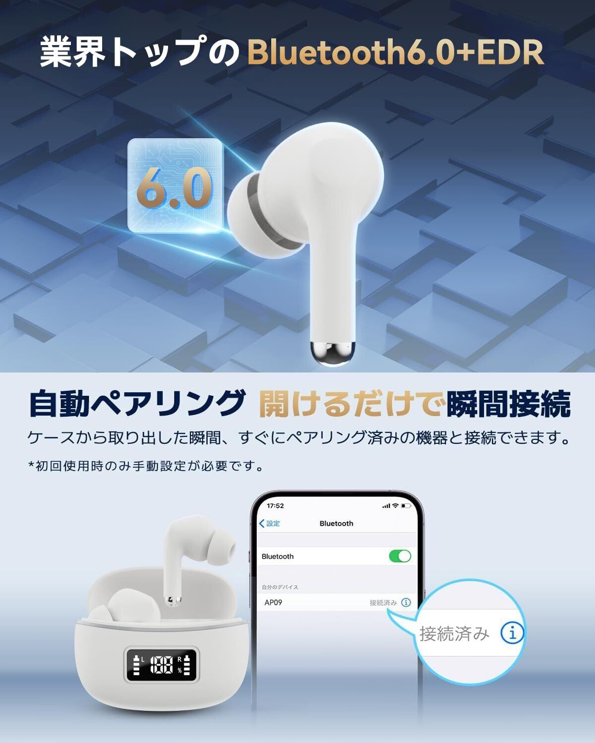 【瞬時自動ペアリング & 優れた互換性】Bluetooth 6.0の遅延が低く、航続が長く、耐干渉性が高い。音飛びや途切れ、遅延、ノイズなどが最小限に抑えられ、安定した通信を実現しています。iOSやAndroid、Windows、タブレットとの互換性も向上しており。瞬時にペアリングする手順:①イヤホンを取り出す。②BLUETOOTHをオンにする。③自動ペアリン。初回ペアリング後、2回目の使用で、蓋を開けて携帯電話に自動的に接続できます。