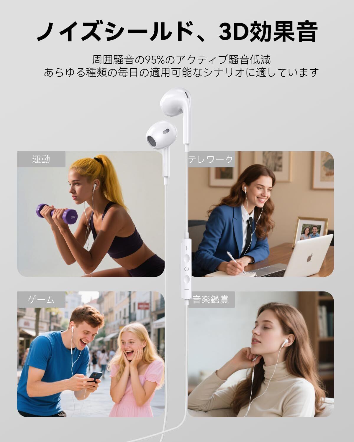 イヤホン 有線イヤホン 3.5mmジャック 音量調整 クリア通話 有線ヘッドセットマイク内蔵 通話対応 快適な装着感 人間工学 絡み防止 小型·軽量 通勤/仕事/ランニング 遅延なし pc/Android/iPhone6/5s対応 (white 半インナー 1個)