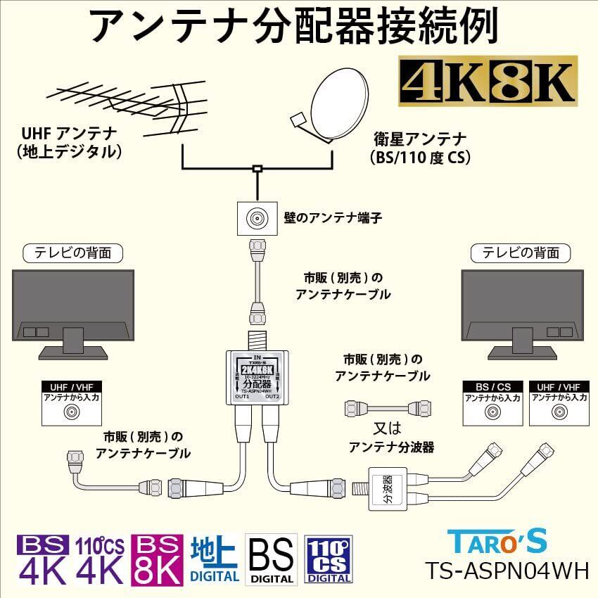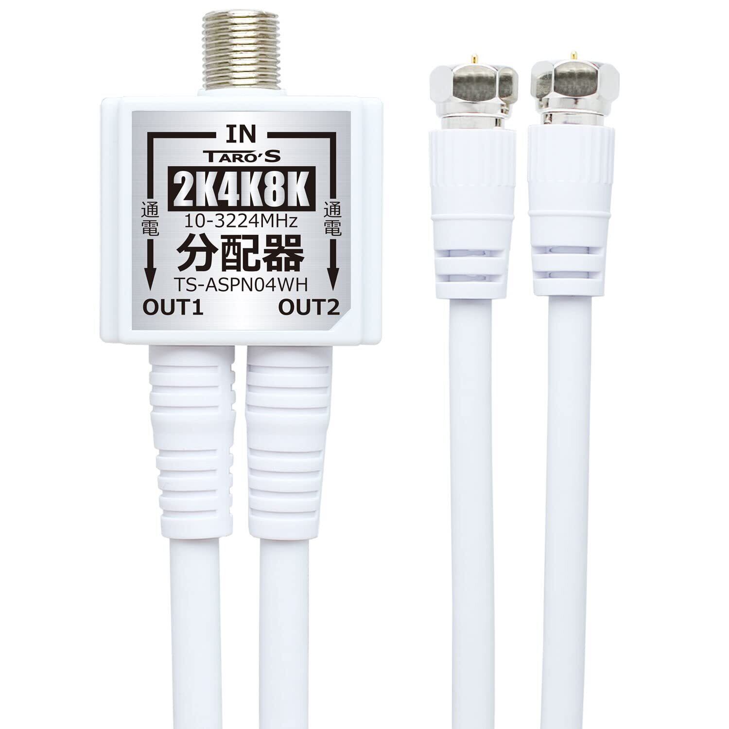 TARO'S テレビアンテナ分配器 4K8K・地デジ・BS・CS・CATV放送対応 2分配 ケーブル一体型 出力側ケーブル付き(50CM)*2 S-4C-FB 全端子電流通過型 日本仕様 ホワイト タローズ TS-ASPN04WH