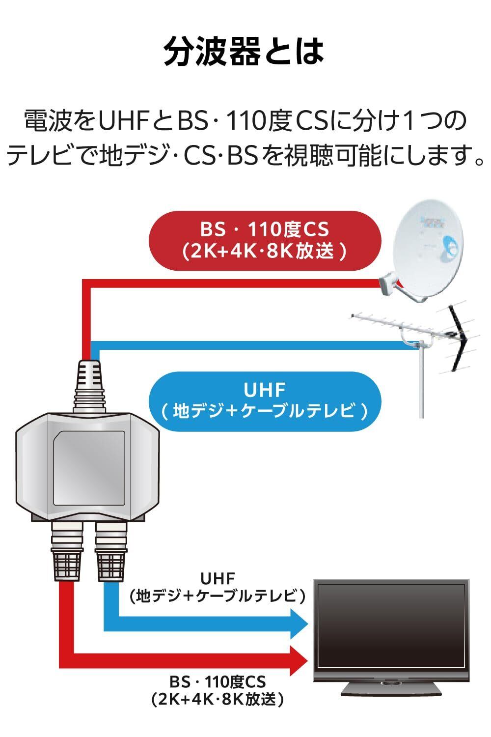 ■入出力側ケーブル付分波器。テレビの電波を地デジ(UHF)とCS・BSに分けます。