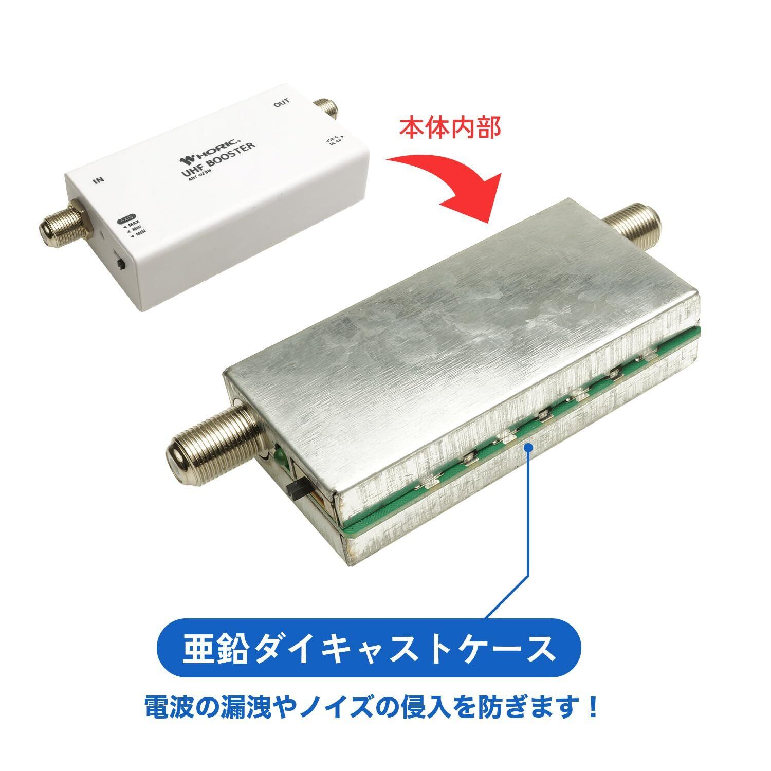 本体内部は亜鉛ダイキャストケースで覆われており、電波の漏洩やノイズの侵入を防ぐ構造になっています。