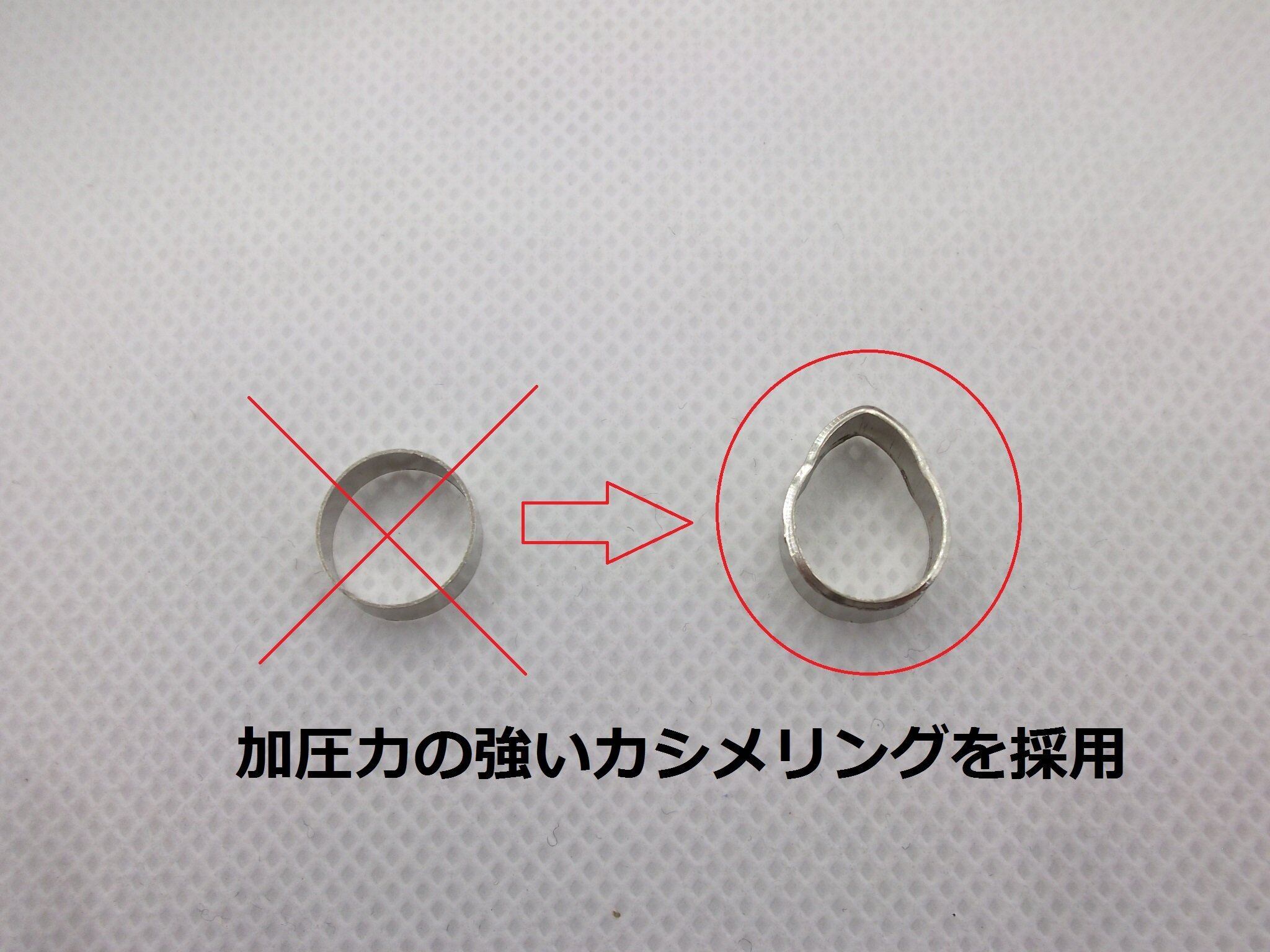 リングはペンチで加工(かしめ)しやすくなっております。(17年12月22日、強加圧リングに変更しました)カシメリングのみの販売も別ページにて行っております。(リングに角は付いておりません)