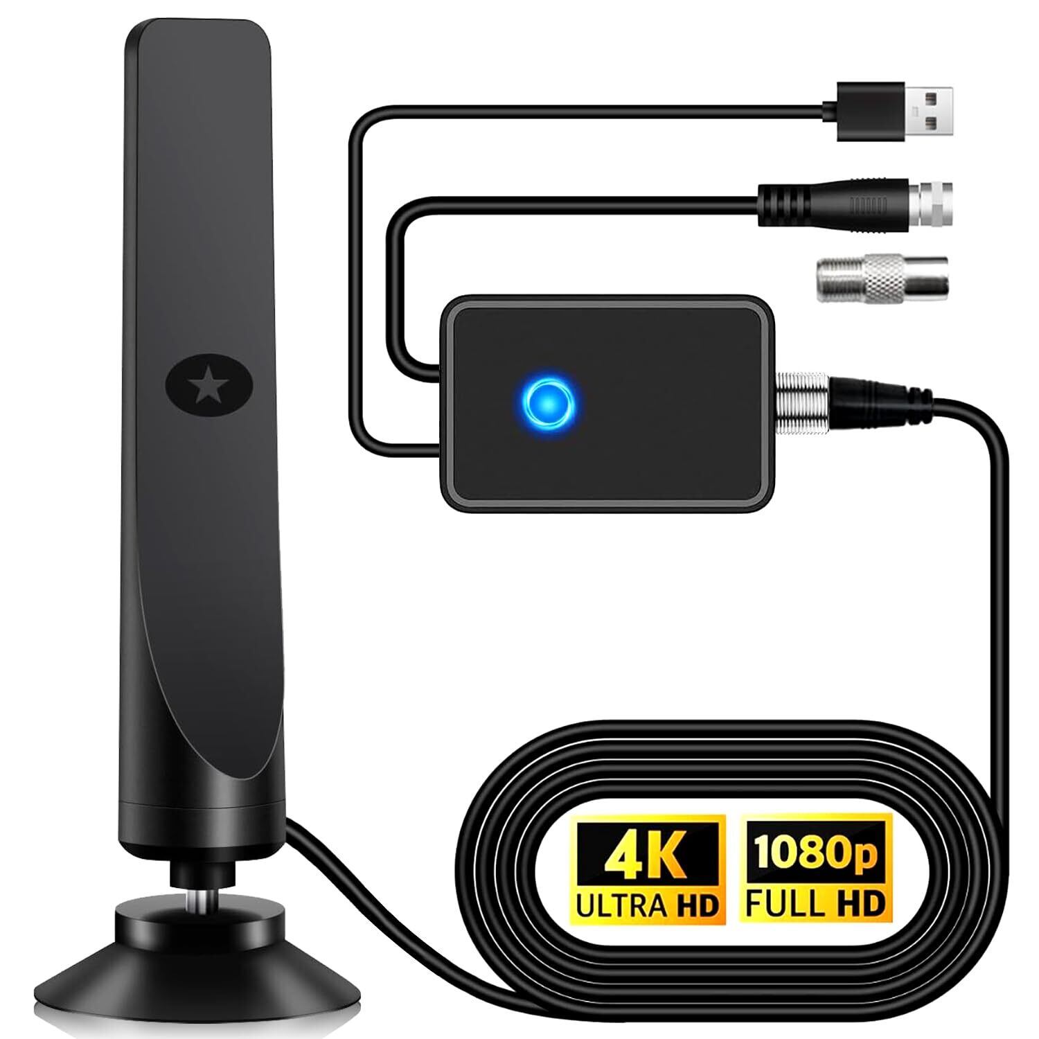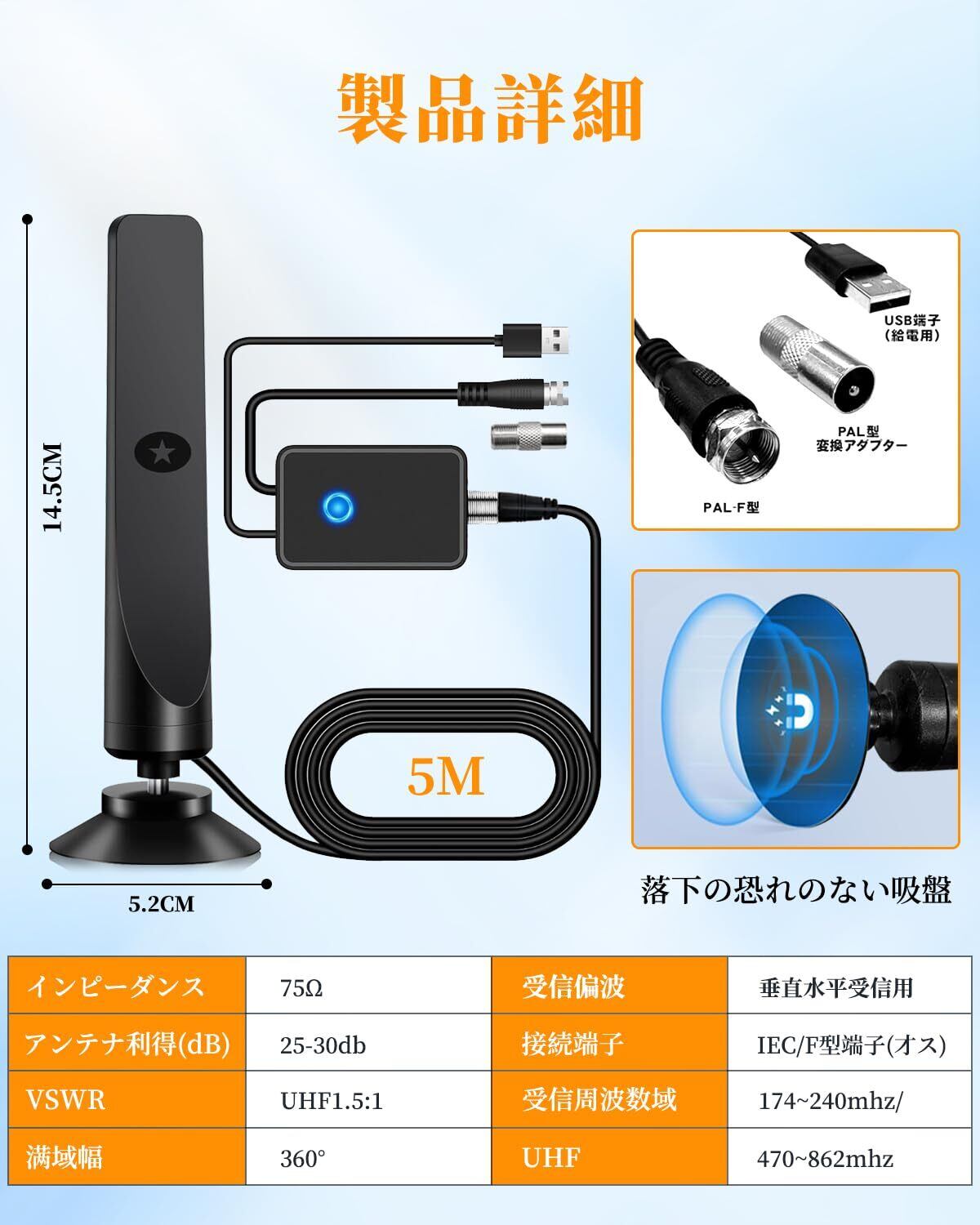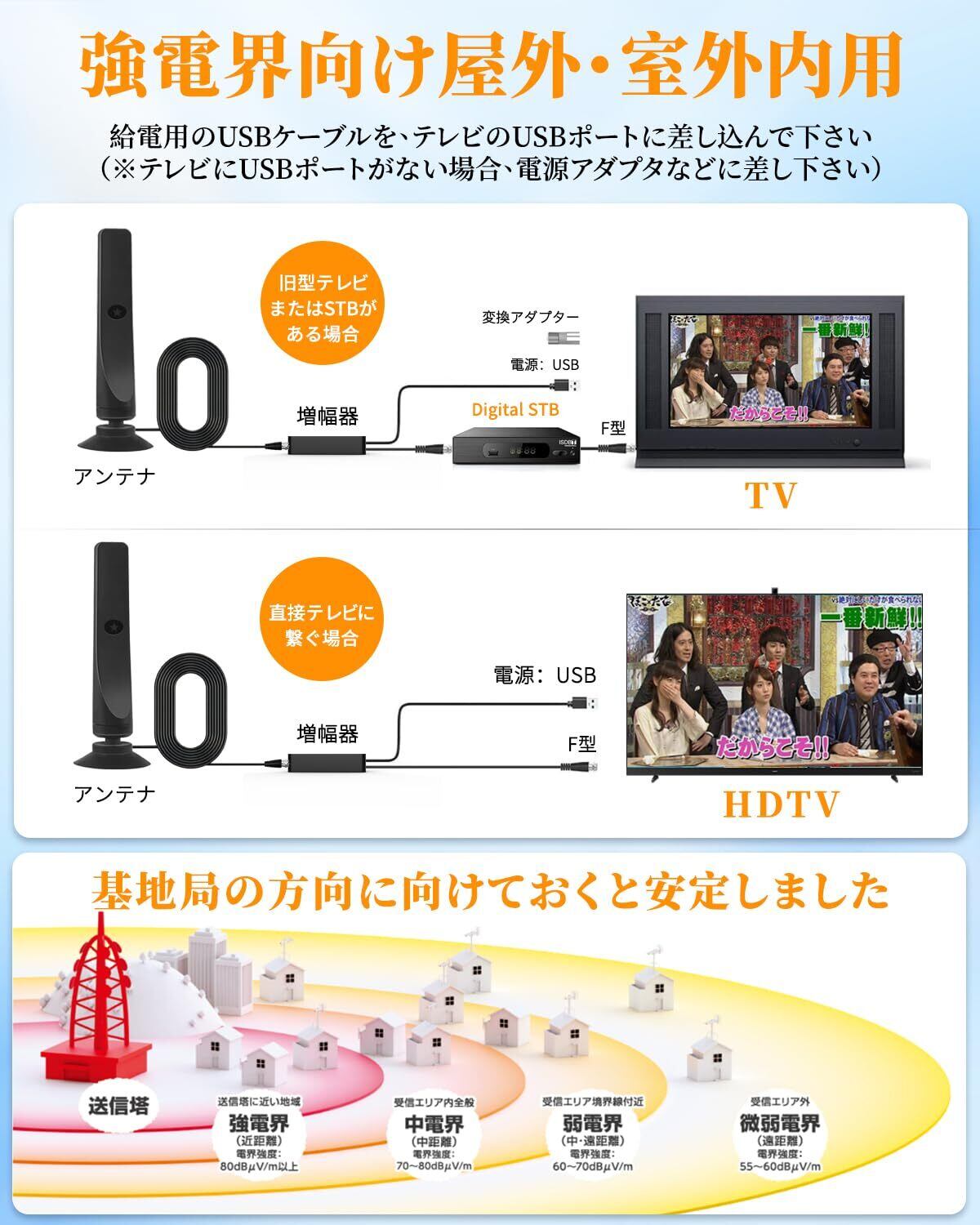 【360全方位受信】360全方位からの電波を受信することができます。私たちのスマートアンテナは独自に開発した適応強化信号増幅器を採用しており、スマートICチップを内蔵しています。過電圧保護機能が組み込まれたSmart IC USB電源アダプタは、DTVアンテナを電源に接続するためのUSB出力がテレビにない場合に役立ちます。