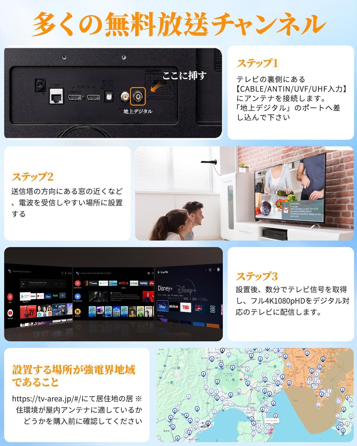 【アンテナ設置位置のガイド】 電波の受信感度は設置場所によって変わります。電波塔からの距離、周辺地形(丘・山)、遮蔽物が受信状態に影響します。大きな電力を消費する機器から遠ざけてください。住宅街だと近隣の建物の影響で受信できる場所と、次の位置でお試しください:基地局側の窓内(窓のサッシや窓の前など)、高い場所(タンスの上、カーテンレールの上など)。電波塔/基地局の方向へアンテナを向けると受信が安定しやすくなります。ご購入なさる前に、利用できるチャンネルと最も近い送信局との距離をご確認ください。