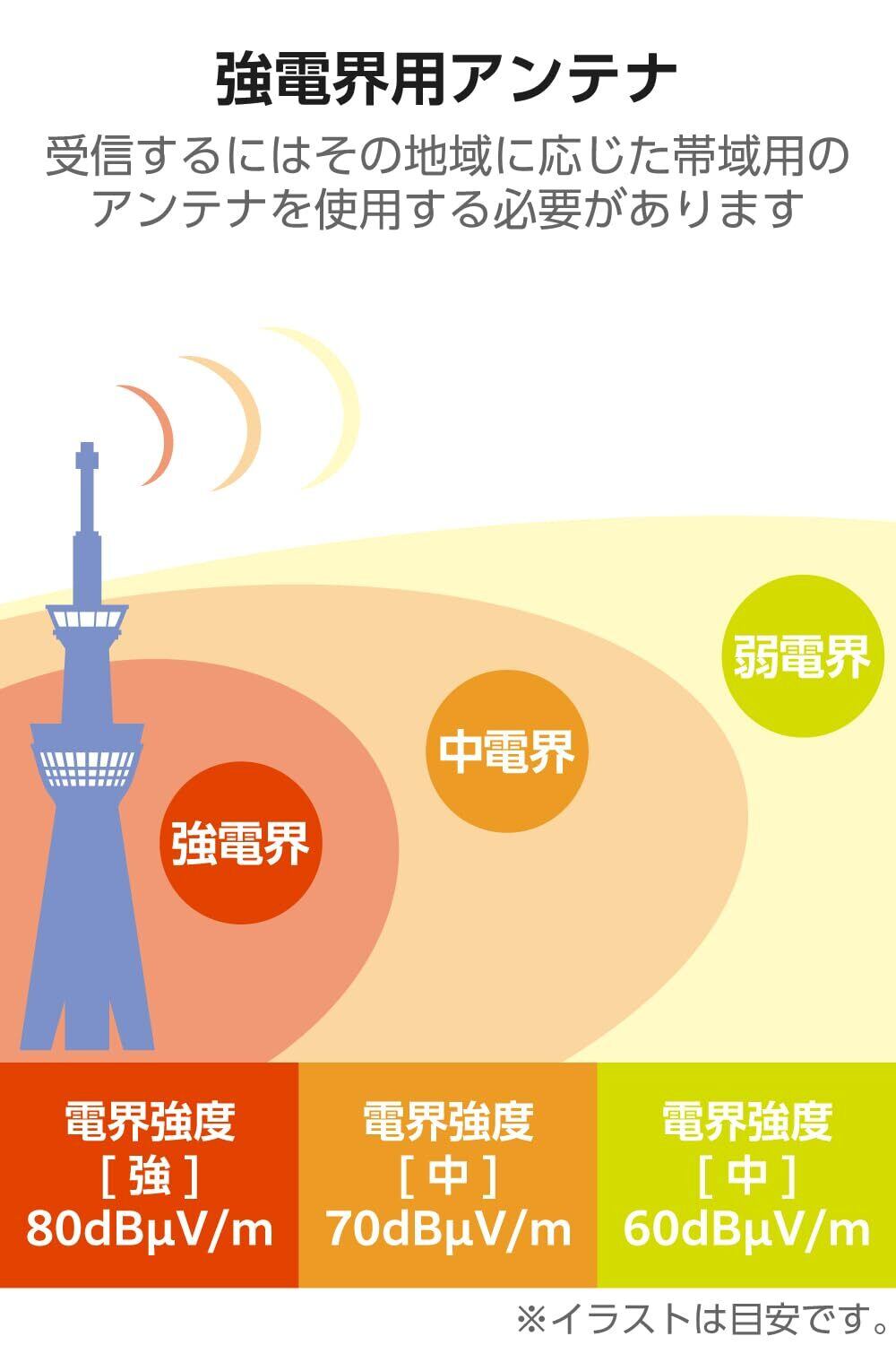 地上デジタル放送を受信するにはその地方に応じたチャンネル異様帯域用のアンテナを使用する必要があり、強電界地域地域受信レベルに最適です。