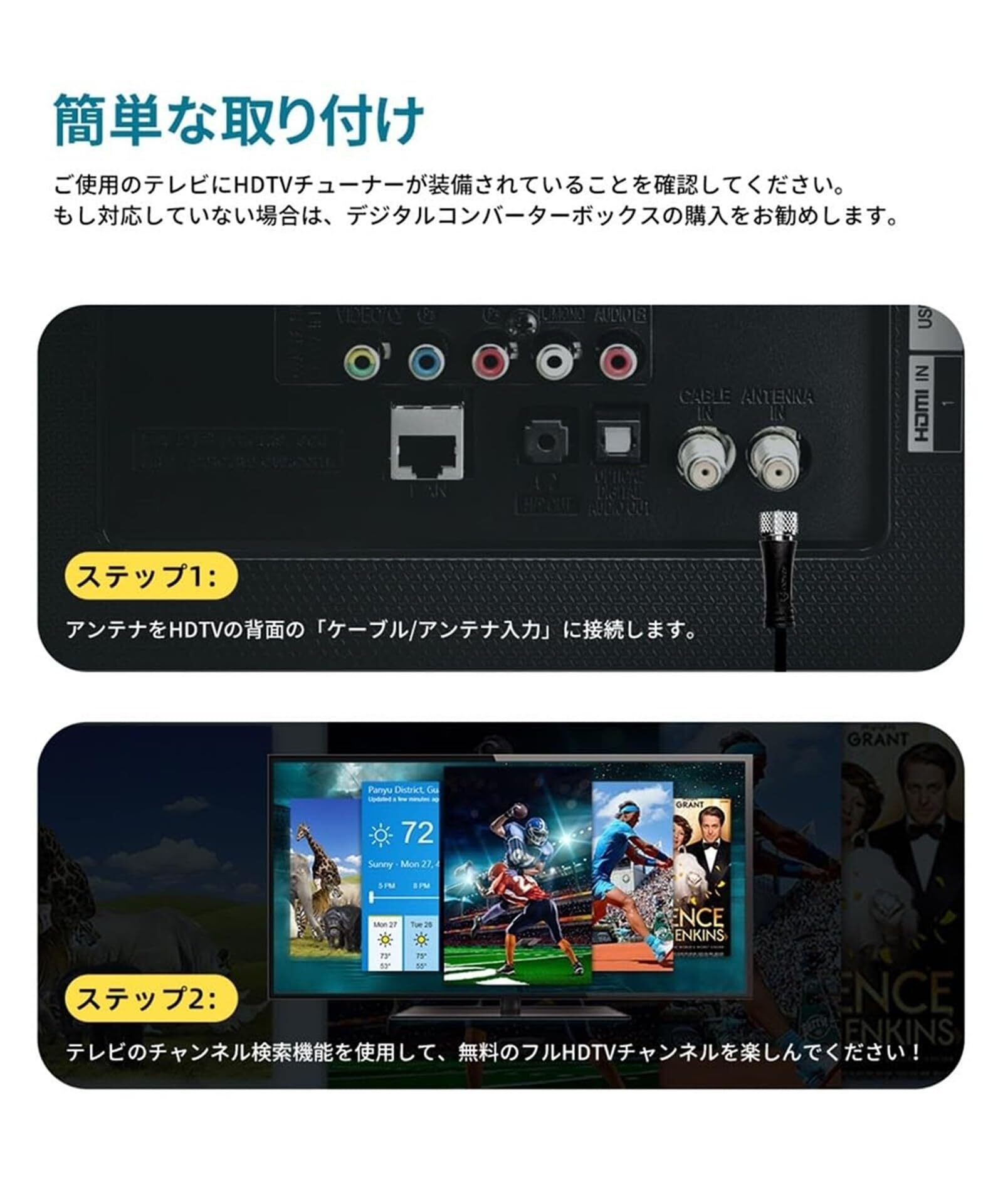 インストールの柔軟性: このアンテナは多様な設置方法に対応し、壁掛け取り付けなど、使いやすいインストールオプションを提供します。