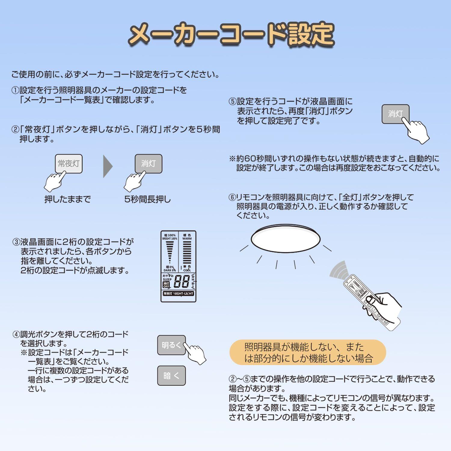 【ご注意ください】当製品の使用にあたりまして設定が必要です。設定方法などはマニュアルをご参照ください 。シーリングタイプの照明器具に適した汎用リモコンです。ペンダント、ダクトレールタイプ等の照明機器では送信される信号が異なるため使用出来ません。照明器具本体が対応していない機能は操作できません。対応メーカーでも全機種の全ての機能のご使用をお約束するものではありません予めご了承くださ。