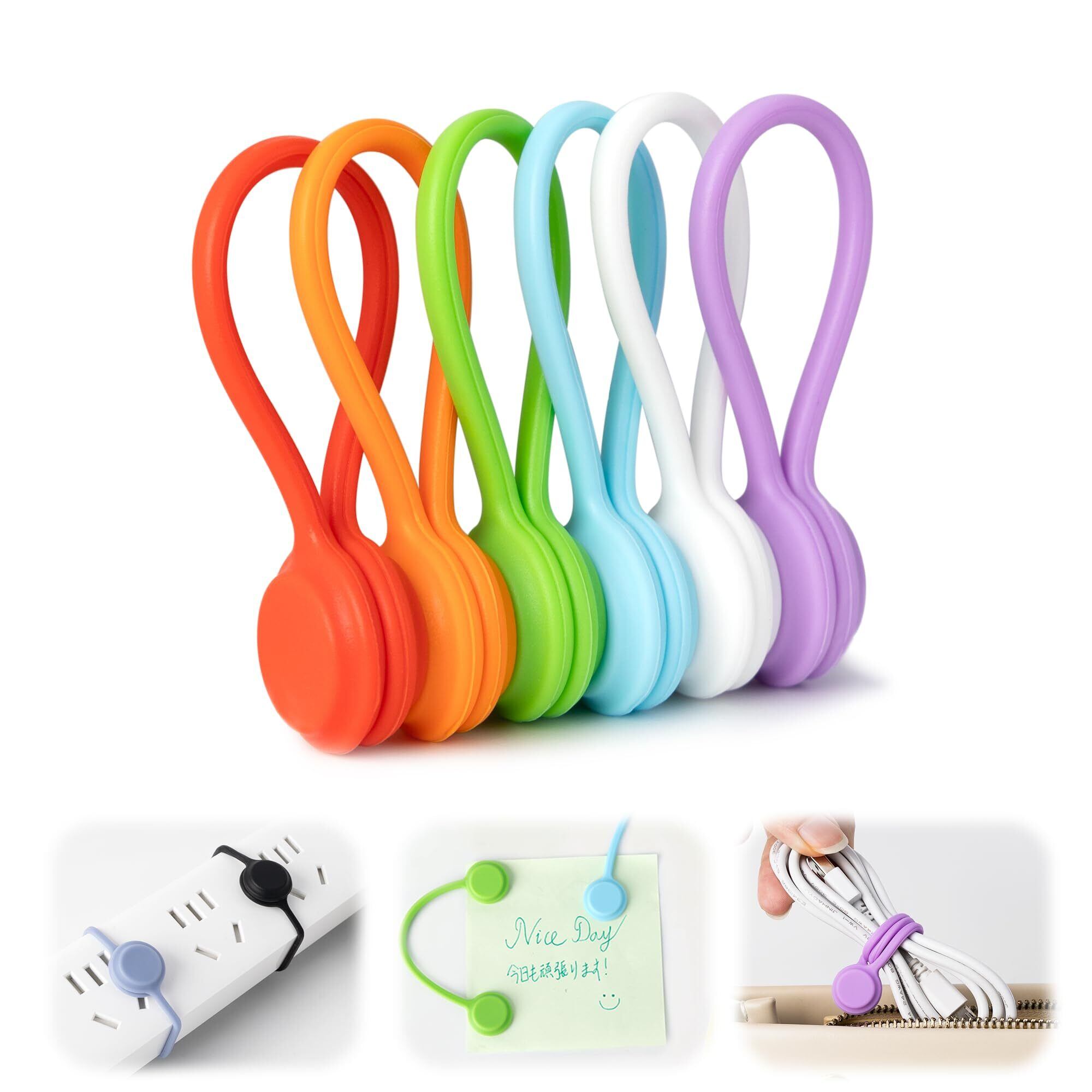 ケーブルクリップ コードクリップ マグネット ケーブル クリップ コード ケーブルホルダー マグネット ケーブルクリップ 配線整理グッズ ケーブル 磁石 収納 固定 まとめる 束ねる 巻き取り USB type-c きつく締める 紛失防止 配線まとめ 車 机 卓上 適用 繰り返し使用可能 (01.虹色・Mサイズ, 6個入り)