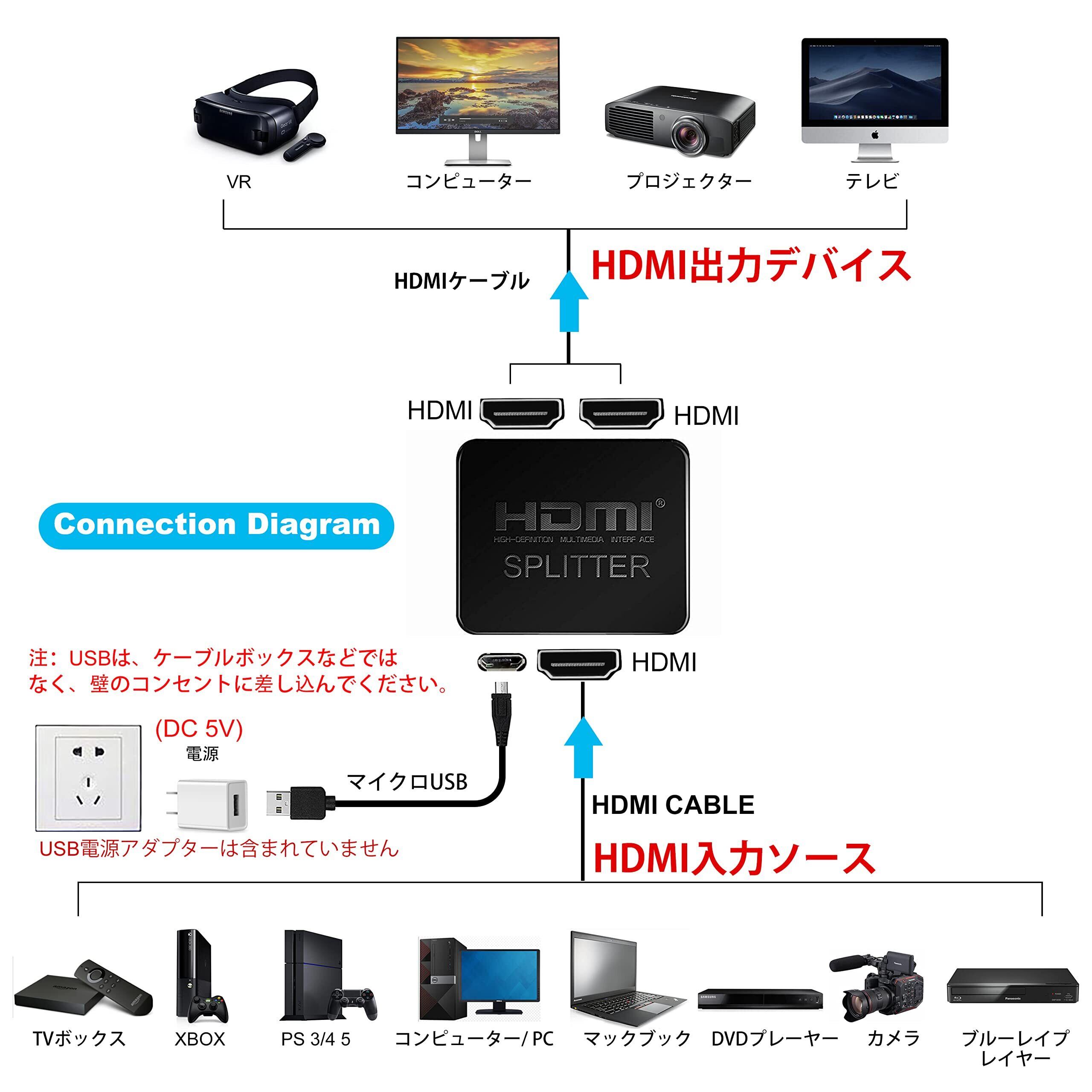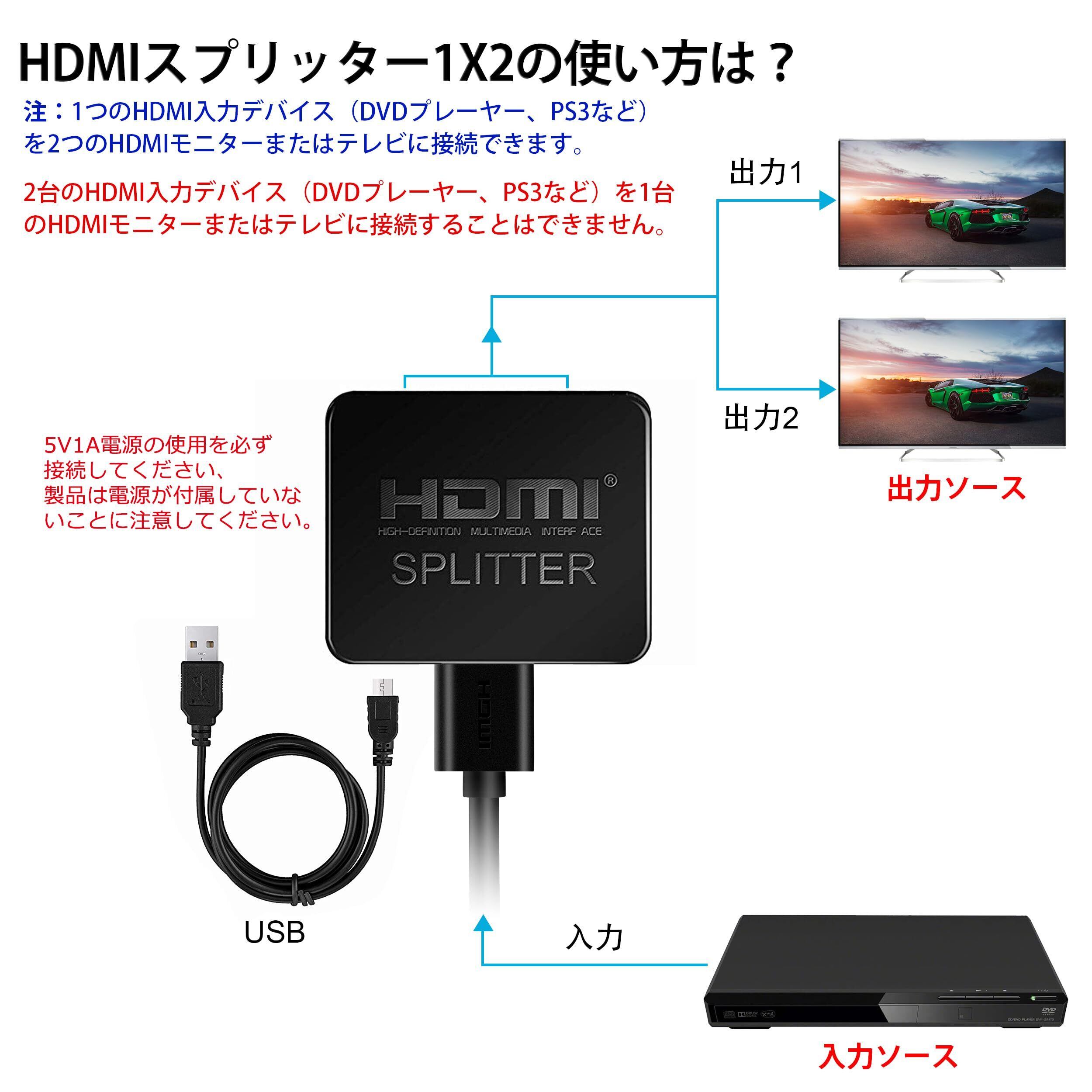 【 間の】: パッケージの内容:1 * HDMIスプリッター+ 1 * 高速HDMIケーブル+ 1 *USB電源ケーブル+ 1 *取扱説明書。 HDMIスプリッター1入力2出力で間のマネーバックゼロリスク購入をします。ご不明な点がございましたら、またはQA経由でお問い合わせください。 私たちはあなたのために問題を解決するために最善を尽くします。