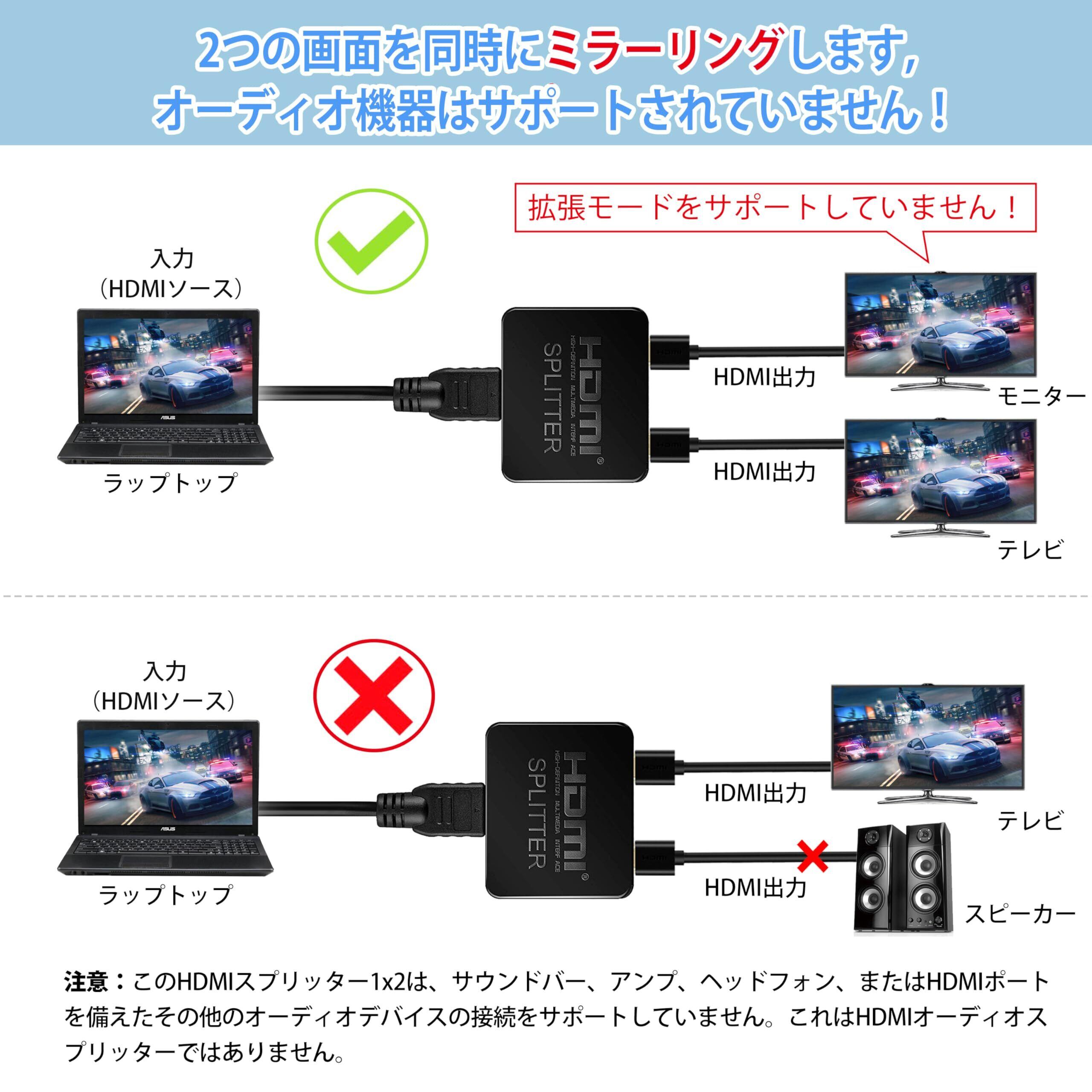 【 幅広い互換性】: HDMI スプリッターは1つの入力をサポートします:Sky Box、Fire Stick、Computer、ゲーム機、Fire TV Stick、Blu-RayDVDプレーヤーなどに適用。同時に2つの同じ出力をサポートします:TV、プロジェクト、モニターなどに適用【注意:このHDMI 分配器 1X2は、サウンドバー、アンプ、ヘッドフォン、またはhdmiポートを備えたその他のオーディオデバイスの接続をサポートしていません。HDMIオーディオスプリッターではありません。】