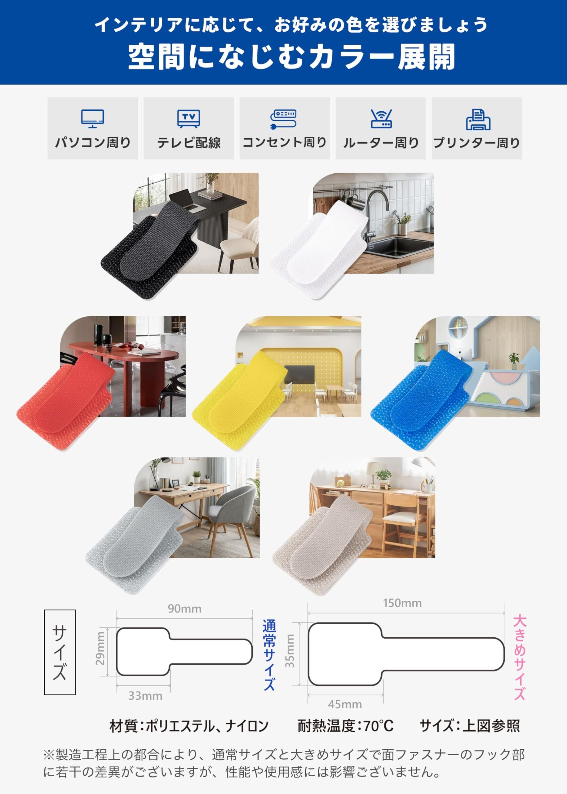【マジックテープ式・複数本のケーブルも自在対応】マジックテープ仕様で、ケーブルの取り外しや再固定が簡単にできます。ループのサイズも自由に調整できるため、細いケーブルから複数本の整理にも対応できます。2サイズ展開で、用途に応じた使い分けも可能です