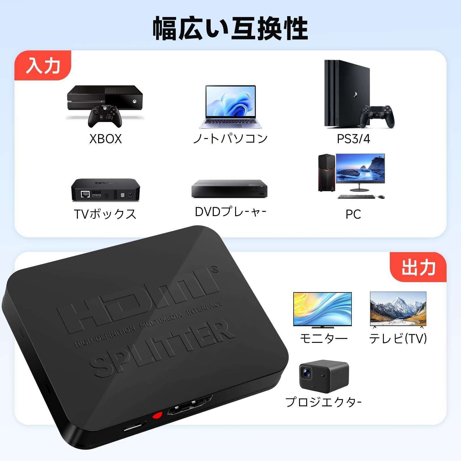 HDMI 分配器 1入力2出力4Kx2K@60Hz/3D/HD対応 HDCP1.4 2画面同時出力 スプリッター 分配機 増設簡単 PC/PS5/PS4/PS3/Xbox/DVD/HDTV/ブルーレイプレーヤーなど幅広く対応 日本語説明書付属 (1.5m HDMIケーブル&USB電源ケーブル同梱)(ブラック)