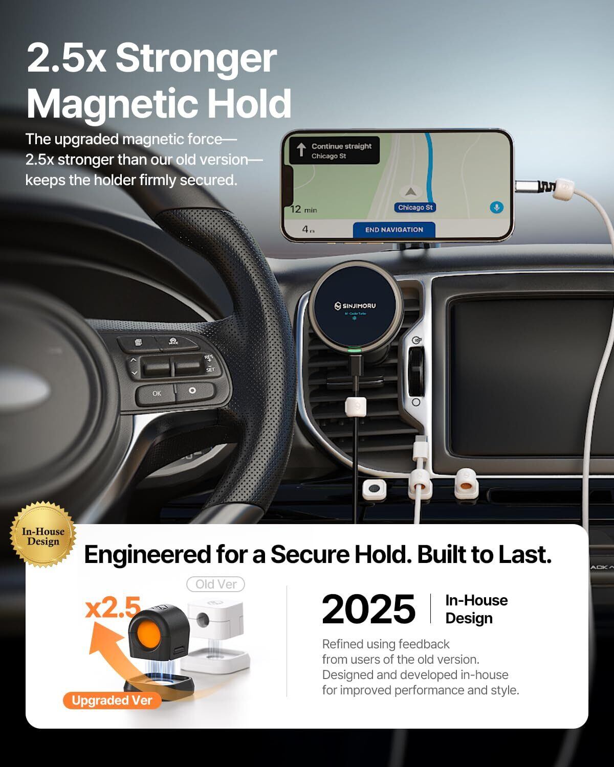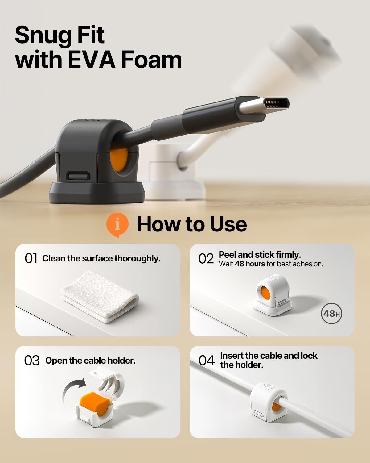 強化マグネット + EVAサポート(自社試験比 約2.5倍): マグネット保持とEVAフォームの補助グリップで、HDMI や編組など重さ/反発のあるケーブルも最大7.5mm径クラスまでしっかり固定 デスク/ベッドサイド/ダッシュボードでのズレ・落下を抑え、毎日の充電や接続で**狙った位置に“置きやすい”**状態を維持