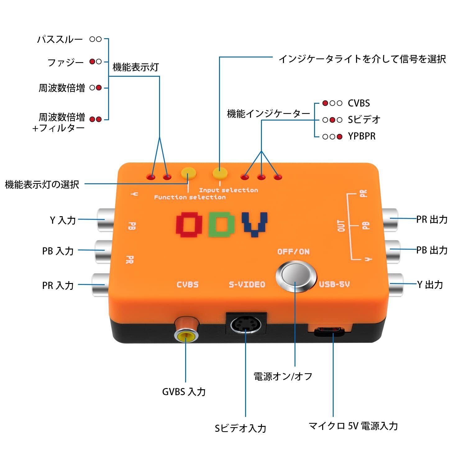 変換方向:S-ビデオ・コンポジット・ビデオ入力をOSSC・キャプチャカード、またはコンポーネントビデオ入力を備えた任意のモニター・およびその他のディスプレイ デバイスに簡単に追加できます。コントロールしやすい。 入力信号と動作状態を表示するボタンと LEDインジケーター。