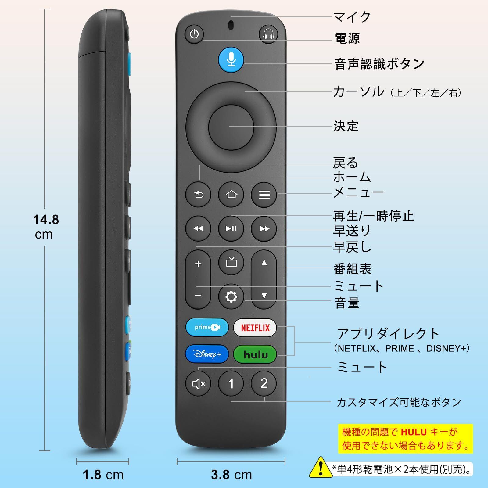 【対応機種】For Stick TV (第2世代/第3世代/Lite/4K)、TV Cube (第1世代/第2世代/第3世代) 、Echo Show 15、All 東芝 ファイヤースティックTVsに適します。※ふぁいやースティックtv リモコンの電源:単4形乾電池×2本使用(別売)。機種の問題でhuluキーが使用できない場合もあります。
