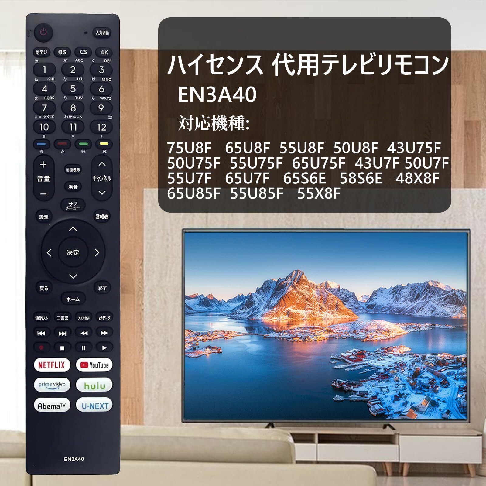 ハイセンス 用テレビリモコン EN3A40 ハイセンス 機種対応 Hisense 液晶テレビ汎用 ハイセンス代用リモコン 軽量化リモコン 太字ボタン 75U8F 65U8F 55U8F 50U8F 43U75F 50U75F 55U75F 65U75F 43U7F 50U7F 55U7F 65U7F 65S6E 58S6E 48X8F 65U85F 55U85F 55X8F