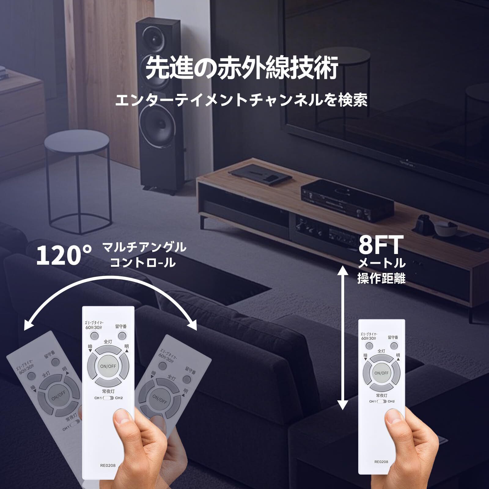 強力な広角赤外線を搭載し、操作距離は約8メートル、左右の制御可能角度は約120度です。 距離や角度に制限されず、部屋の隅々からでも簡単に操作できます。