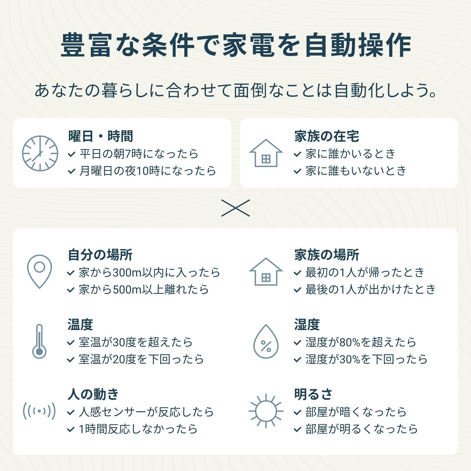 【7つの細やかなオートメーション】「曜日・時間、位置情報・温度」に加え、「湿度・照度・人感」の条件で家電を自動で操作。人が通ったら電気をオン、部屋が暗くなったら電気をオンということも可能です。
