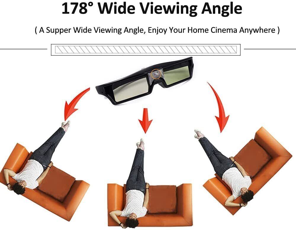 【178°の広視野角】フルサイズの大型レンズ、広視野角、このDLP LINK 3Dアクティブシャッターメガネは最新のアクティブシャッターテクノロジーを採用し、画像効果は繊細でリアルで、画像は高精細、ちらつき、ゴーストがありません、高コントラスト、高輝度、よりスムーズな3D表示体験をお届けします。 178°の超広視野角により、ご家庭で映画のような効果をお楽しみいただけます。