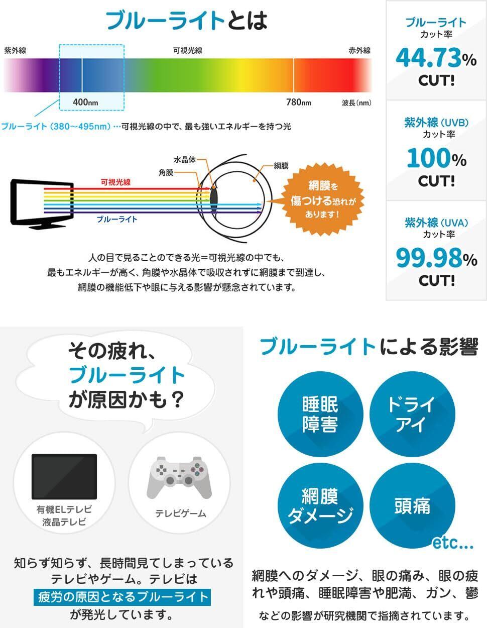 【高品質&ブルーライトカット率】このブルーライトカットパネルは、台湾製の高品質なアクリル素材を使用しています。ブルーライトカット率44.73%!ブルーライト領域(380~495nm)を44.73%カットします。紫外線カット率(395nm)99.9%(SGS検査機関にて実証済)このパネル1枚で家族全員をブルーライトから目を守ります。映像の鮮明さを損なわないカット率で取り付け後も変わらず綺麗な映像をお楽しみいただけます。