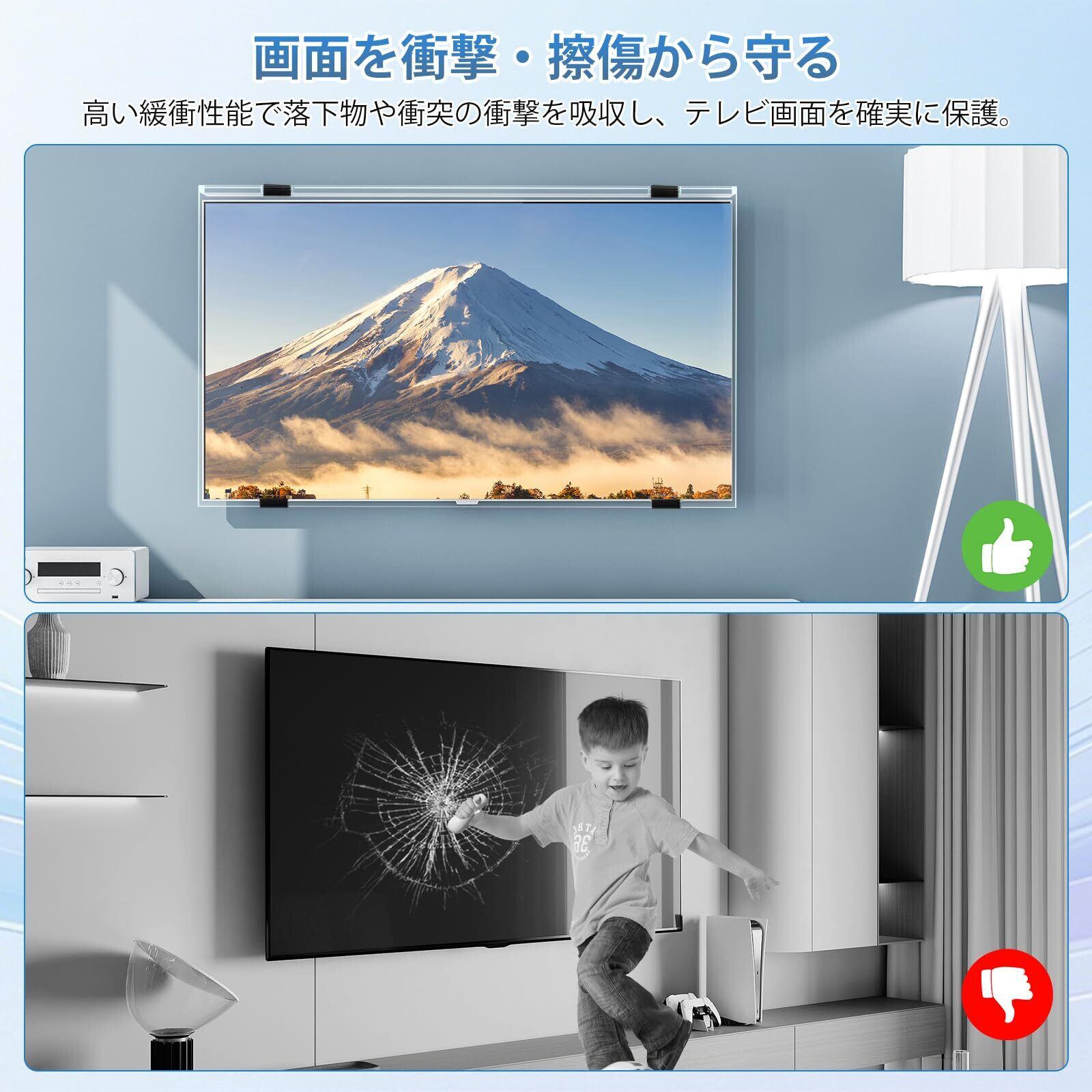【優れた高品質アクリル素材】テレビ保護パネルは、高品質のアクリル素材を採用し、厚さ3mmで画面を360度保護し、55インチのテレビ画面を衝突や傷痕から守り、お子様の遊び中の衝突やペットの爪でも画面が傷つく心配がなく、長期間安心使用できます。特殊加工表面は指紋が付着しにくく、HD画質を維持します。家庭や商業施設で広範囲に利用されています。