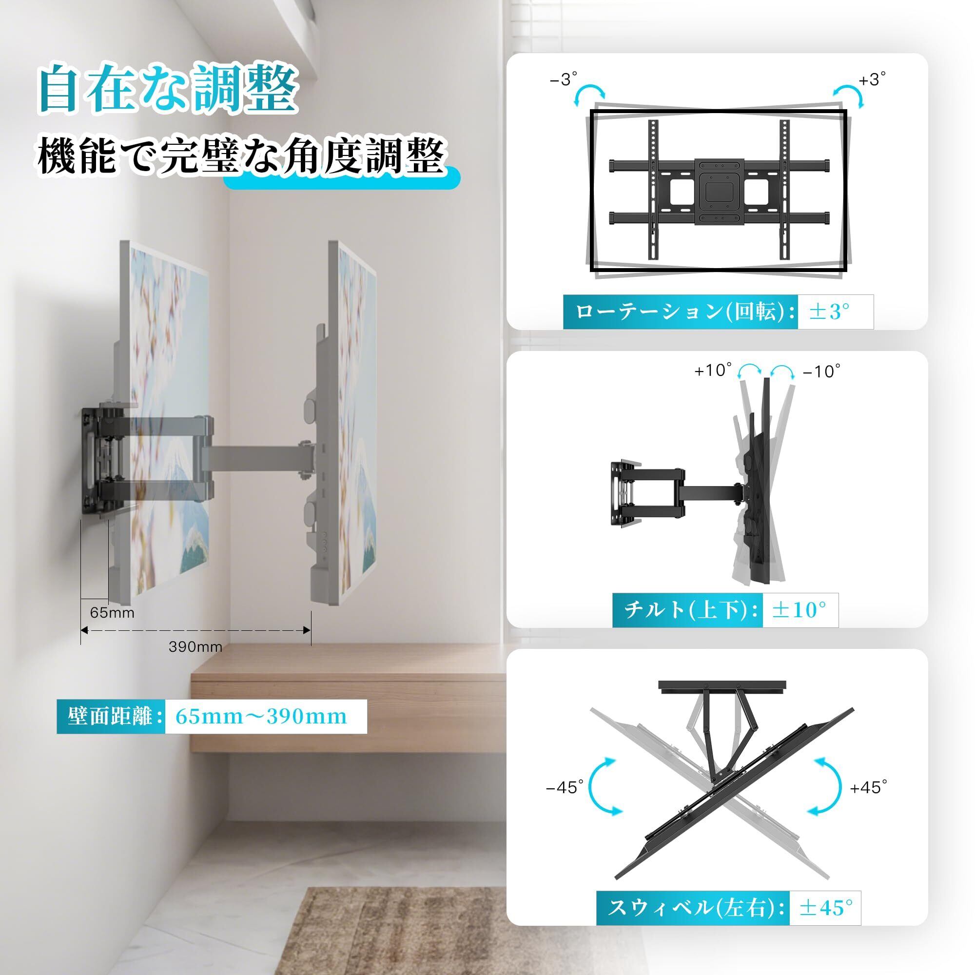 【省スペース設計でインテリアもスッキリ】BONTECの壁掛け金具は、壁からわずか65mmの位置に収納でき、最大390mmまで伸びることができます。これにより、大型テレビでもスリムでスタイリッシュな外観を保ち、リビングやオフィスのスペースを効率的に活用できます。また、付属のケーブルタイで、配線を整理し、クリーンで美しいインテリアを実現します。
