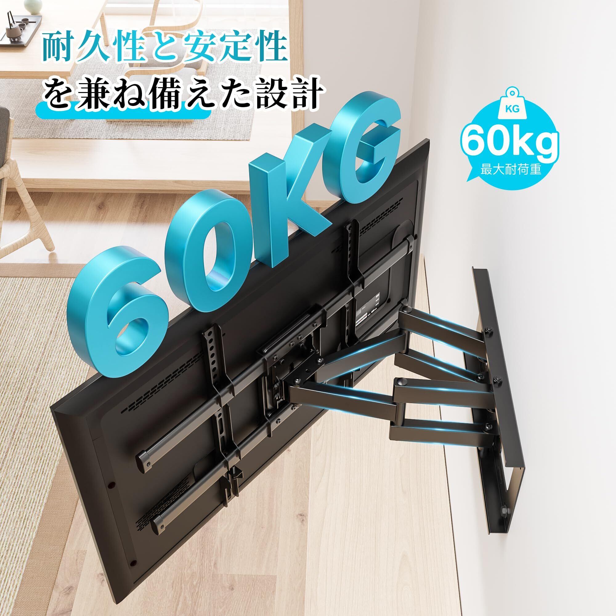 【頑丈な構造と安全性】BONTECのテレビ壁掛け金具は、冷間圧延鋼で作られた丈夫なデュアルアームを採用しています。これにより、最大60kgのテレビをしっかりと支えることができ、安全にお使いいただけます。六角レンチを使用してボルトをしっかりと締めることで、テレビが下向きにならないように防止できます。頑丈で長持ちする設計で、安心して使用可能です。