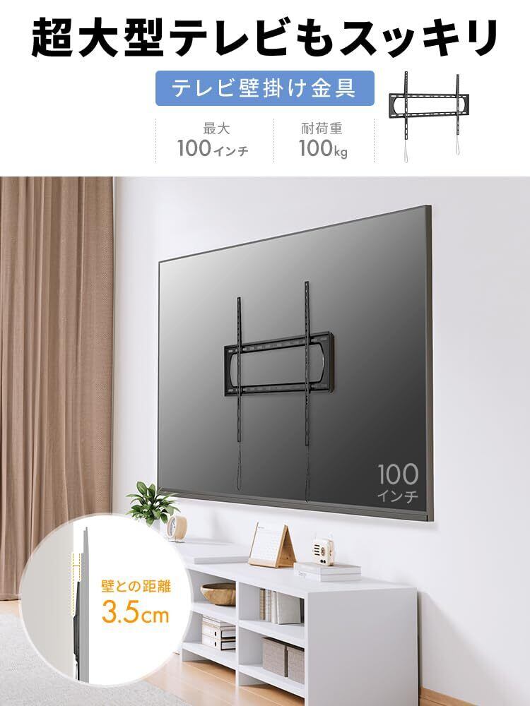 【100インチの大型テレビもOK!】 薄型設計の壁掛け金具で、お部屋をすっきりとした空間に。100kgまで対応しているので、重厚感のある大画面テレビも安心して設置できます。壁との距離はわずか3.5cmの超薄型タイプ!