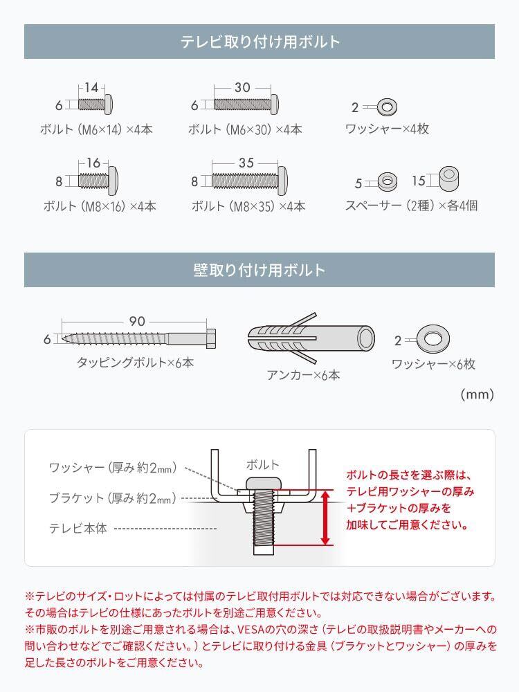 【対応】 VESA規格(横×縦):200×200、200×300、300×200、200×400、400×200、300×300、300×400、400×300、600×200、400×400、600×300、400×600、600×400、700×400、800×400、600×600、800×500、800×600、900×600(mm) 対応テレビ:42~100インチ程度 テレビの耐荷重:100kgまで