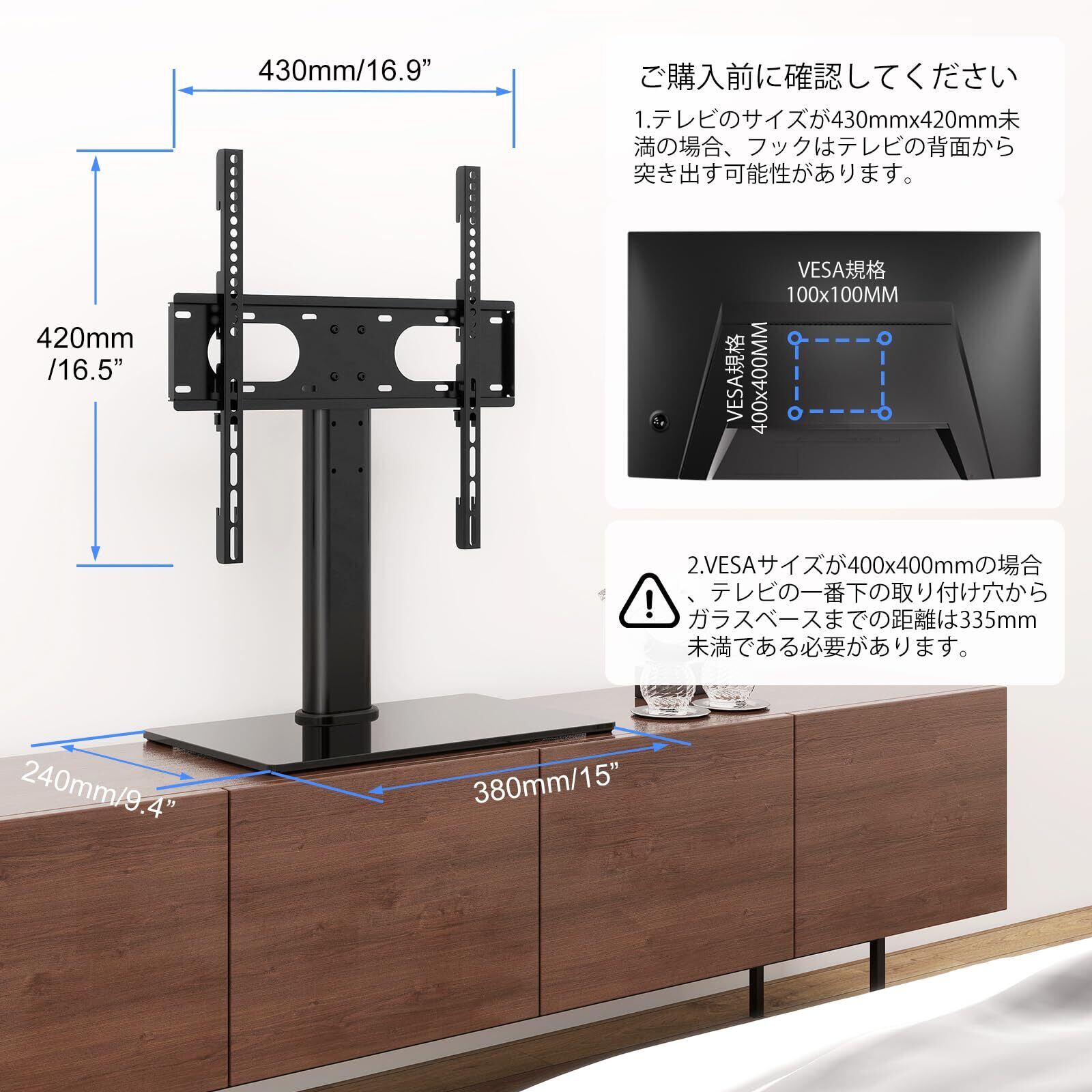 【耐荷重・対応機種】耐荷重は40kgで、32-55インチの液晶テレビ、モニターに対応しています。テレビ用ブラケットはVESA 100×100、200×100、200×200、300×200、300×300、400×200 、400×300、400×400mmに対応しています。