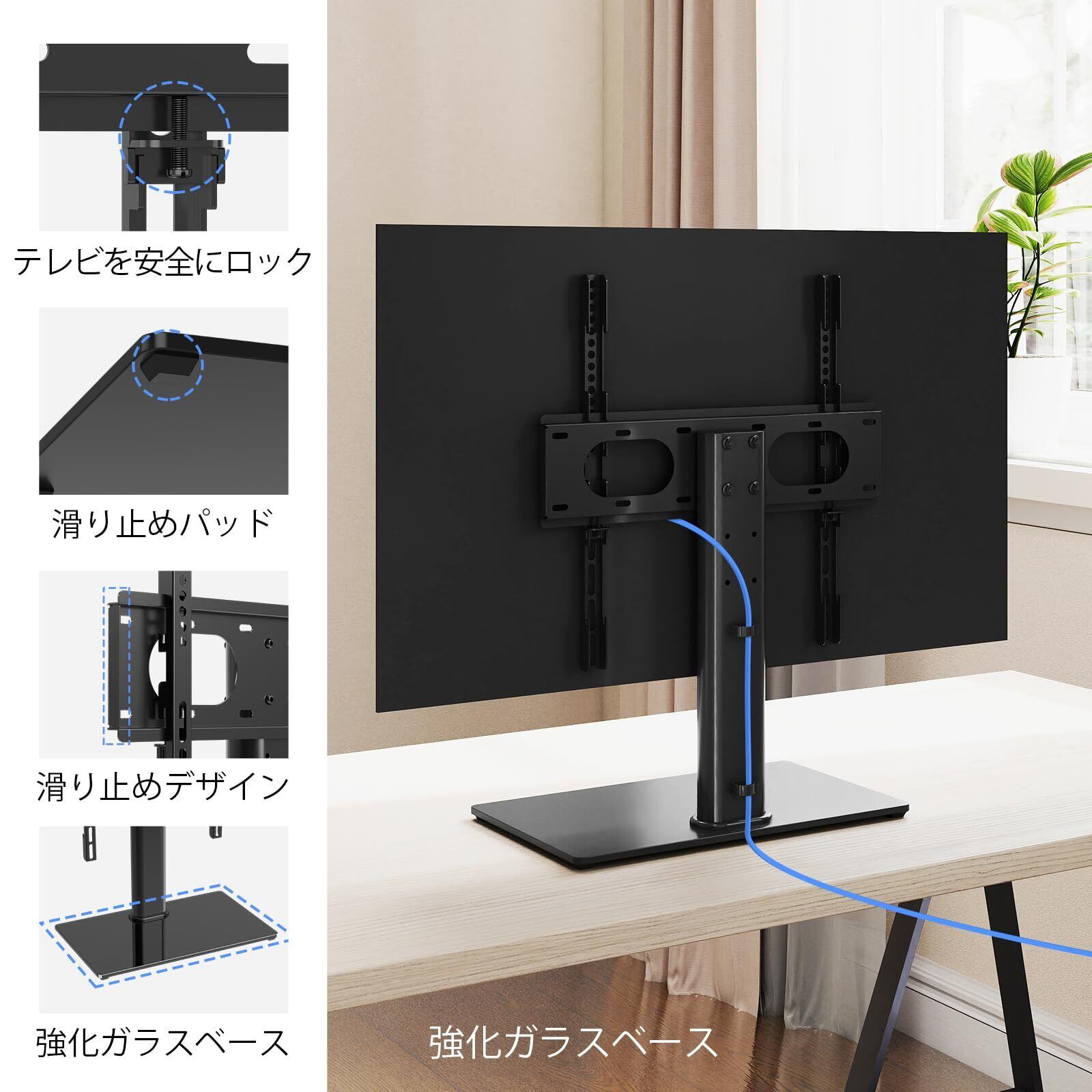 【完璧なデザイン】ブラケットは「ロックデザイン」を設計されてます。テレビのVESAを確認した後、追加ボルトと金属製プレーオでブラケットを固定して、ブラケットの動きを防ぎます。それに、下の棚板には滑り止めゴム足もついています。ベースが強化ガラスで作り、壊れにくく、製品の寿命が長くなります。ケーブル管理システムが付き、テレビとAV機器の周辺を綺麗に保ちます。