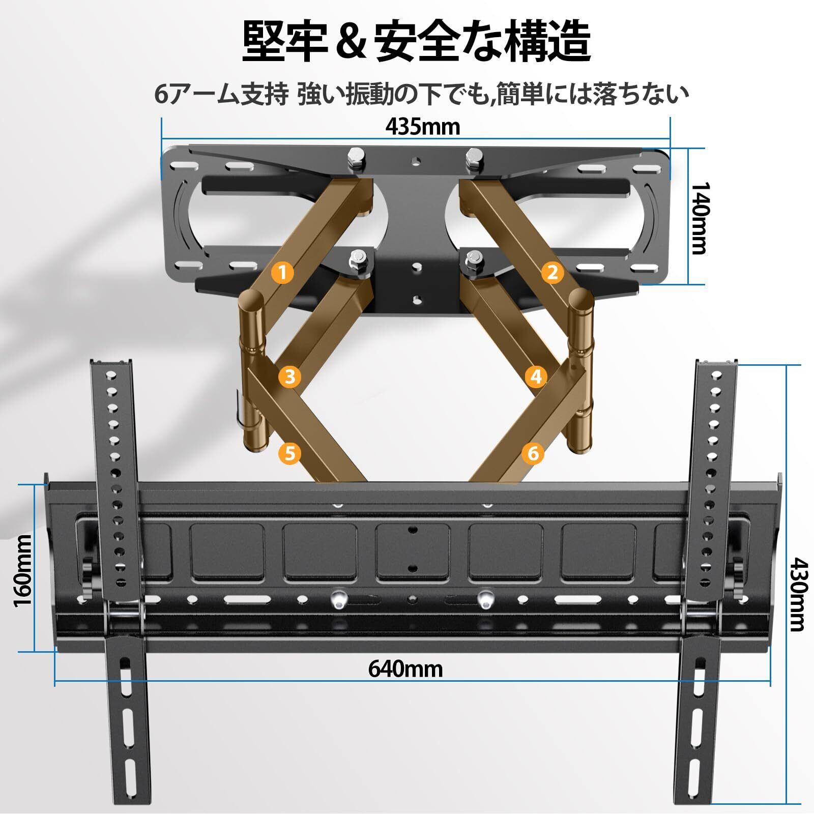 【安心・安全】:6 本の超強力なアームで構築されたこのマウントは、最大50KGのテレビを安全に保持できます。安全性は、横方向の動きを防止する信頼性の高い安全ラッチと、より大きく重いテレビを簡単に支える頑丈で幅広の壁プレートによって強化されています。壁プレートにはテレビをさらに保護するための保護サイドパッドも付いています。ご注意:下地ない石膏ボード壁に取り付けないでください。
