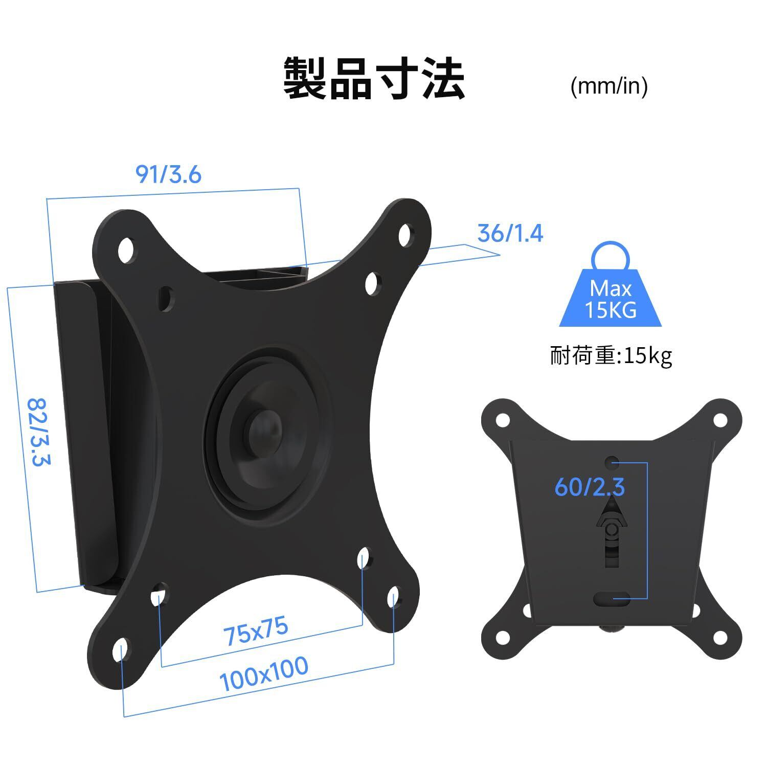 【商品仕様】15~30インチまで対応の液晶テレビ用壁掛け金具です。カラー:黒材質:合金鋼VESA規格:75×75mm、100×100mm耐荷重:15KG<パッケージの内容>テレビ壁掛け金具、タッピングネジ×2本、プラスチック膨張×2本、レンチ×1本、M5*25ネジ×4本、M4*20ネジ×4本、M6*25ネジ×4本、スペーサーD8*11×4本、スペーサーD8*6×4本、ワッシャーD4*12×4本、ワッシャーD5*10×4本、日本語取付説明書 ※VESA規格とは・・・「VESA」という業界団体が策定した規格で、多くの液晶テレビの裏にある金具用のネジ穴のサイズや位置などが規格化されています。 本商品は、このVESA規格に対応しています。