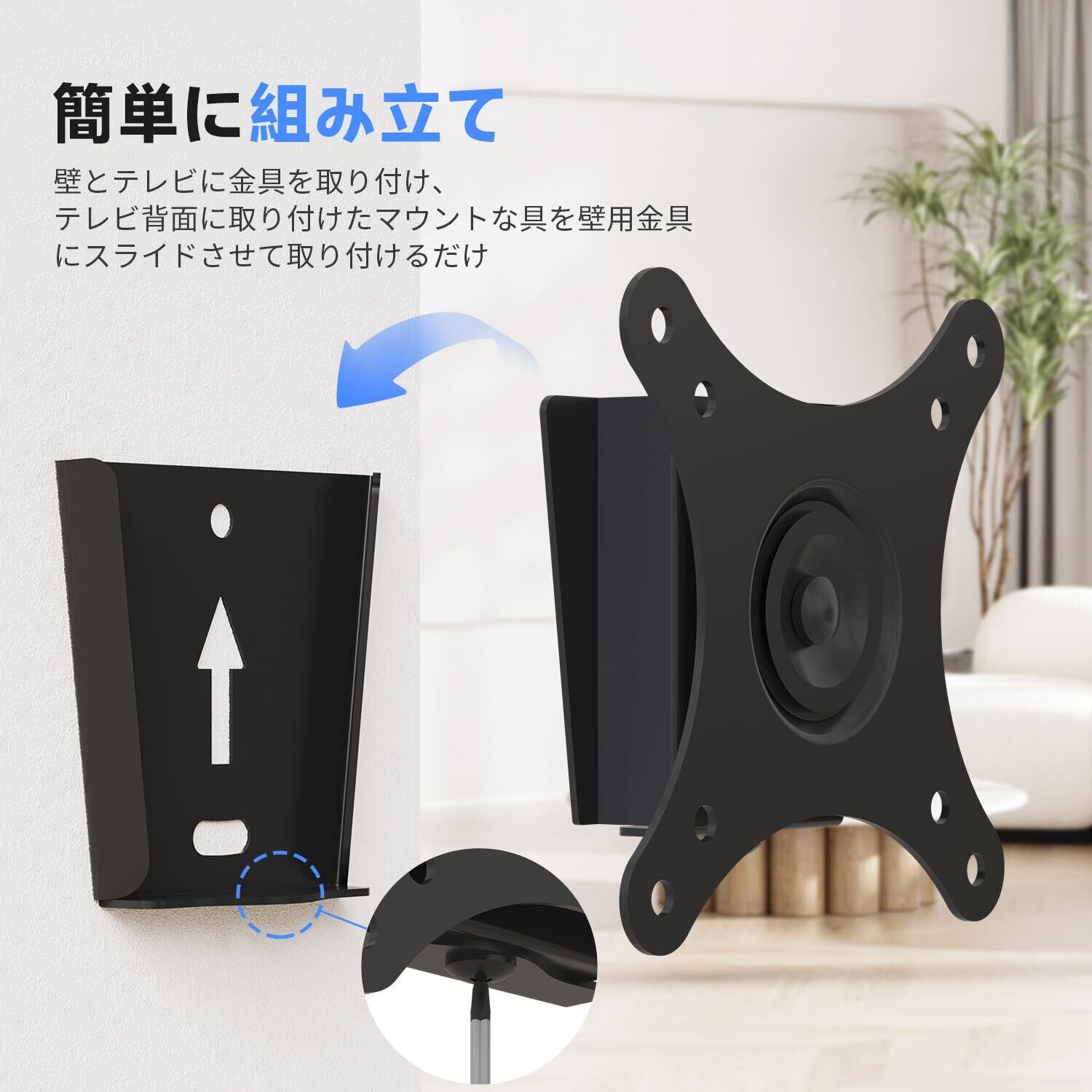 【取付簡単】シンプルな構造なので、壁とテレビに各金具を取り付け、テレビ背面に取り付けたマウントな具を壁用金具にスライドさせて取り付けるだけ。 壁からテレビの距離は約36mmと圧迫感もなく、取付必要な部品が揃っていて、取付は簡単です。