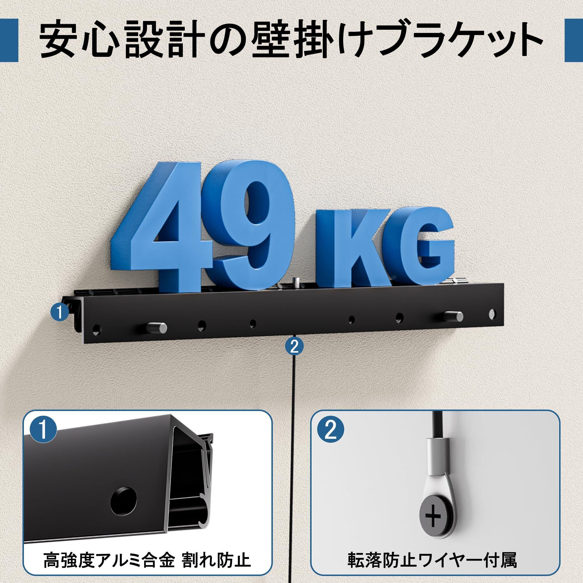 【頑丈な固定金具による転倒防止】テレビ壁掛けは高品質アルミニウム合金製で、3段階の強度検査をクリア。最大49kgの耐荷重設計により高い安定性と耐振動性を実現。付属の安全ワイヤーでTVを二重固定し、転倒・落下を確実に防止します。