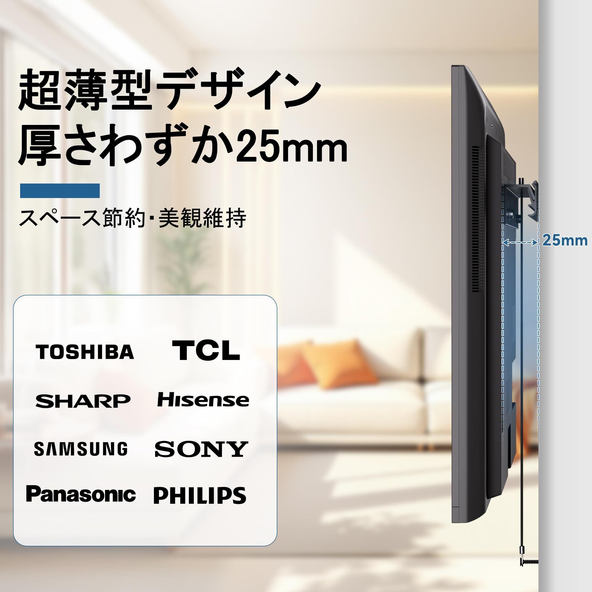 【薄型設計で日常使いに便利】壁掛けテレビ金具の壁面突出はわずか25mmの設計により、+5°の角度調節を実現。リビングや寝室でのテレビ 壁掛けで空間効率化が可能で、テレビ下部の清掃も容易。