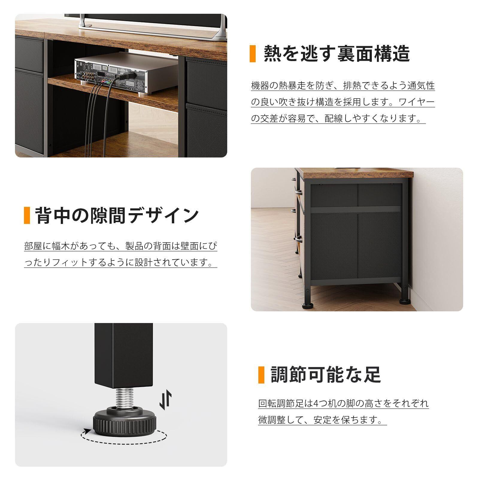 配線地獄を解消するテレビ台 ローボード:棚板後部のオープンデザインにより、HDMIケーブル/電源コードを隠蔽可能。CD・DVDプレーヤー等の発熱機器の放熱性を確保しつつ、見た目もスッキリ。美観と実用性を両立したテレビボード。