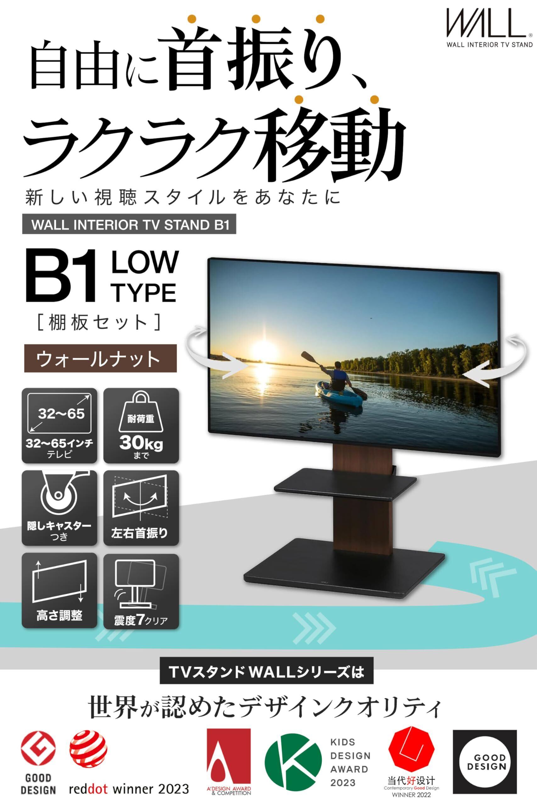WALL B1 テレビスタンド + 棚板付き セット 隠しキャスター付き 首振り ロータイプ ウォールナット 耐震 震度7対応 高さ4段階調整 32~65インチ対応 取り外し可能 棚付き サウンドバー対応 スピーカー置き 可動式 移動式 自立 壁寄せ テレビ台 穴開けない 工事不要 組立簡単 背面収納 おしゃれ 壁掛け風 tv stand EQUALS イコールズ ウォール