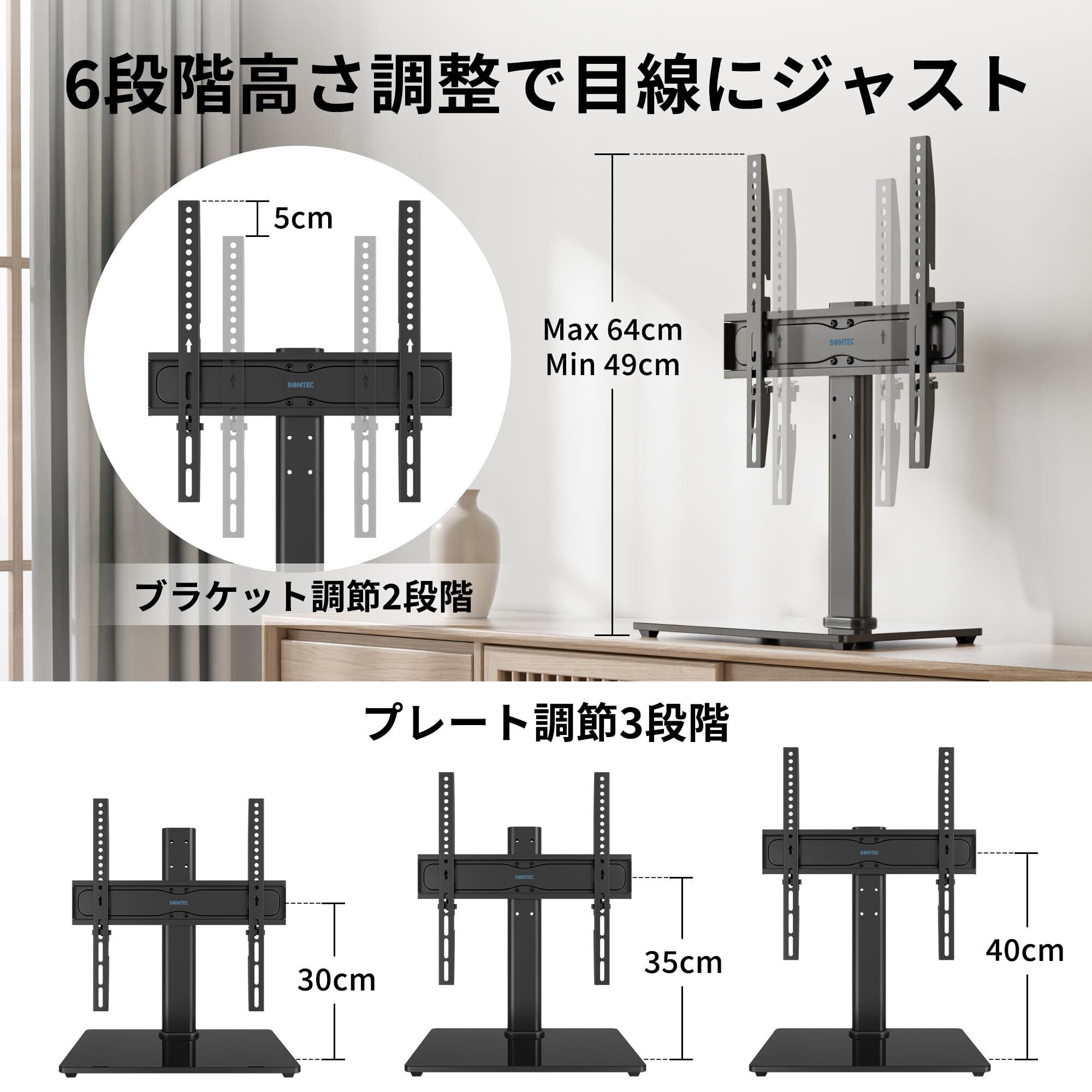 BONTEC テレビスタンド ロータイプ テレビ台 ユニバーサル テーブルトップ ペデスタル TVスタンド 壁寄せテレビスタンド 対応 24-60インチ LCD/LED/プラズマTV用 高さ調整可能 ケーブル管理 強化ガラスベース VESA 400x400mm 最大耐荷重40kg