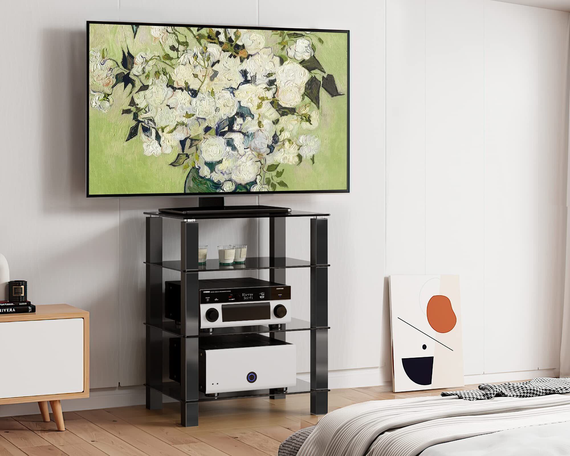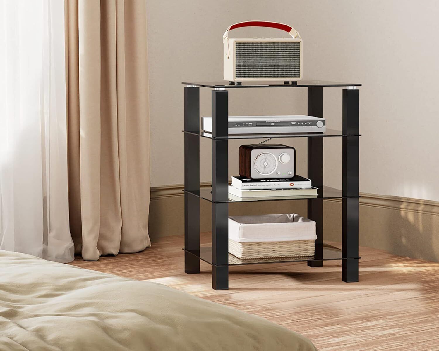 FITUEYES オーディオラック パワーアンプキャビネット オーディオスピーカーアンプキャビネット CDアンプ機器収納 プリンタブラケット ホームストレージシェルフ 強化ガラス オープンタイプ 北欧風 ブラック 4段 AS406002GB