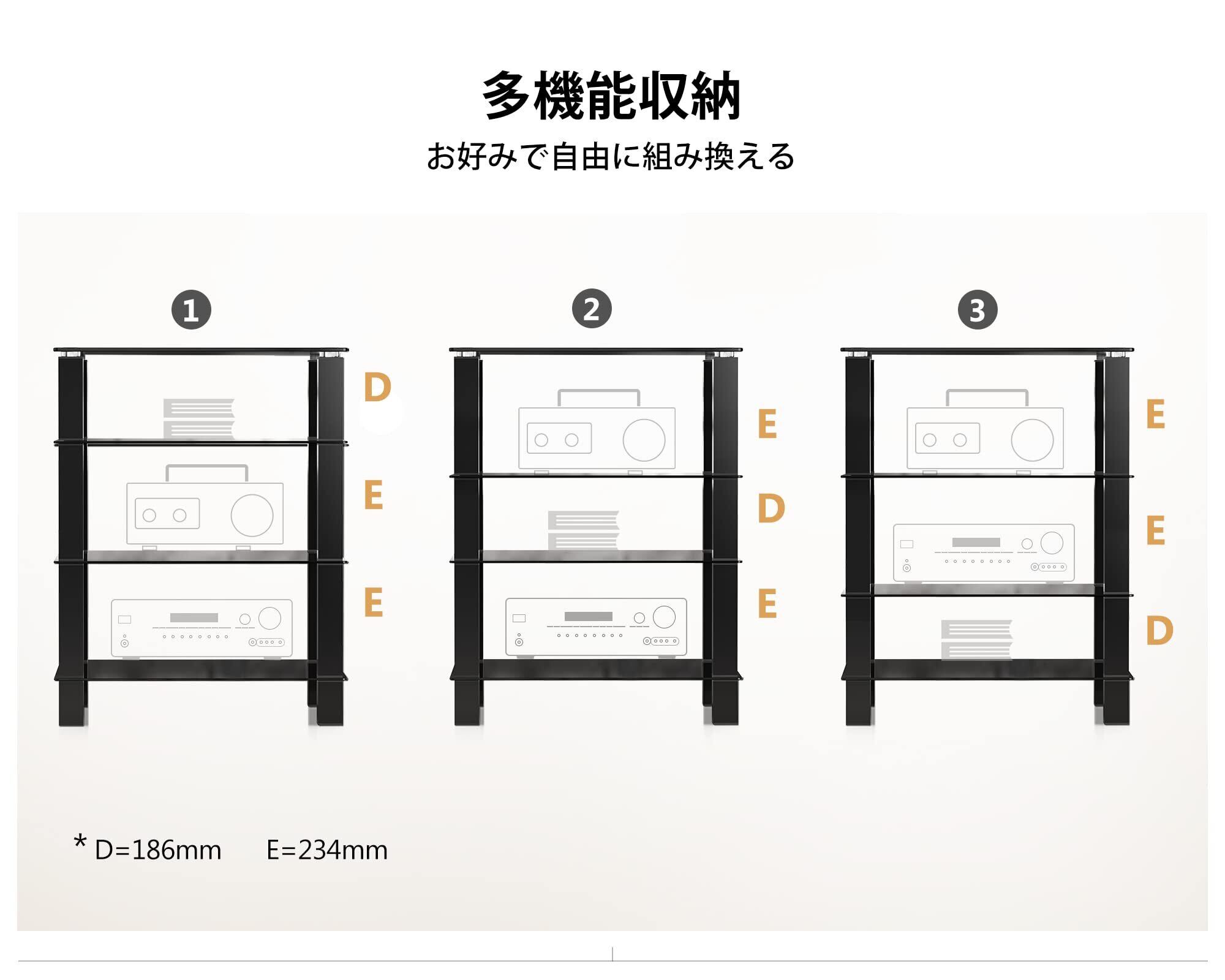 「棚空間の調整」:オーディオラックは短い方管の取り付け位置によって、棚の間隔が186mm/234mmに自由に変えられます。レコードラックやavラックとして、いろんな設備が余裕に収納できます。
